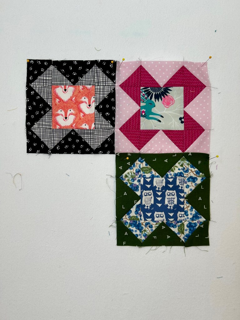 I made a few–they can make up fast using fabric strips and an already cut 3.5 inch block AND the rulers that cut half-square triangles with light and dark strips layered AND the Simple Folded Corner ruler for the flying geese block. Maybe I will continue, but I have some other projects that are drawing me more. Maybe a leader/ender? It is a cute block…and one can make light and dark variations.