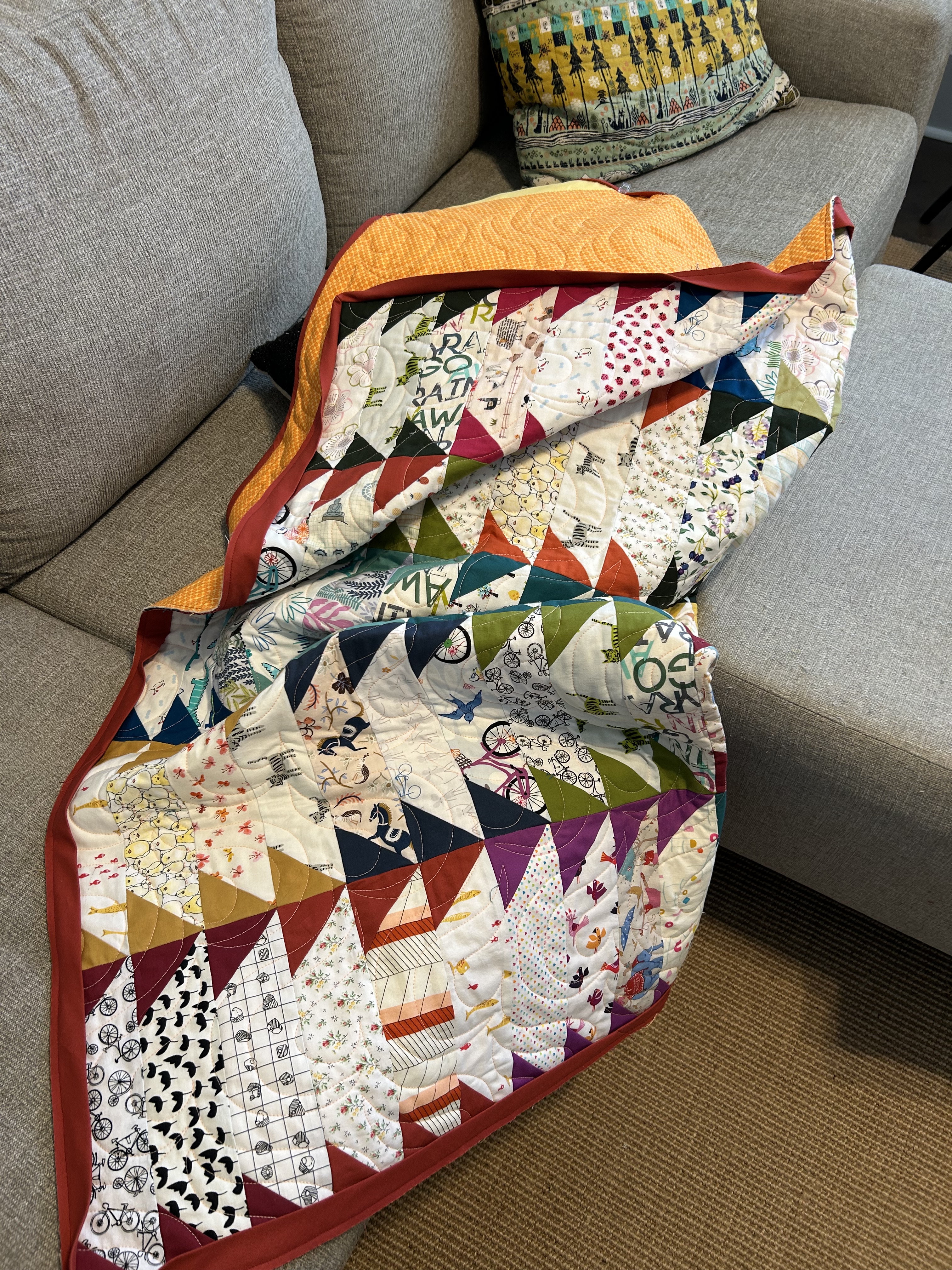 This as yet nameless little neutral “Stacks” quilt–a Tara Faughnan pattern from season 2 of The Color Collective years–is off the longarm, trimmed, bound, and has its binding installed. So I have night sewing once more. It’s so cute.