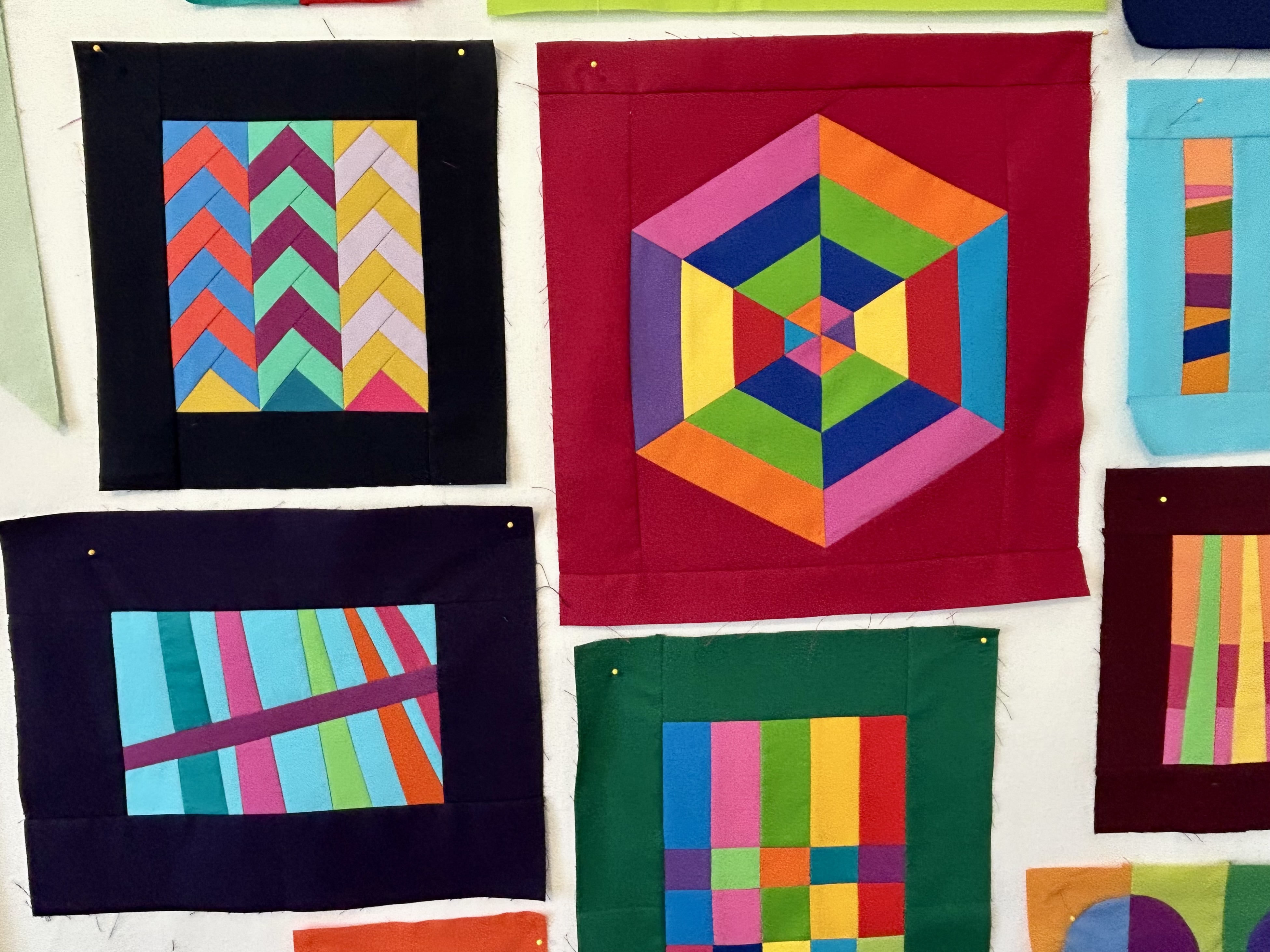 There are so, so, so many ways to manipulate this block idea and so many colors with which to play in this month’s palettes. My two finished blocks are made from the brighter fabrics; the in-process block uses some of the duller/softer colors.