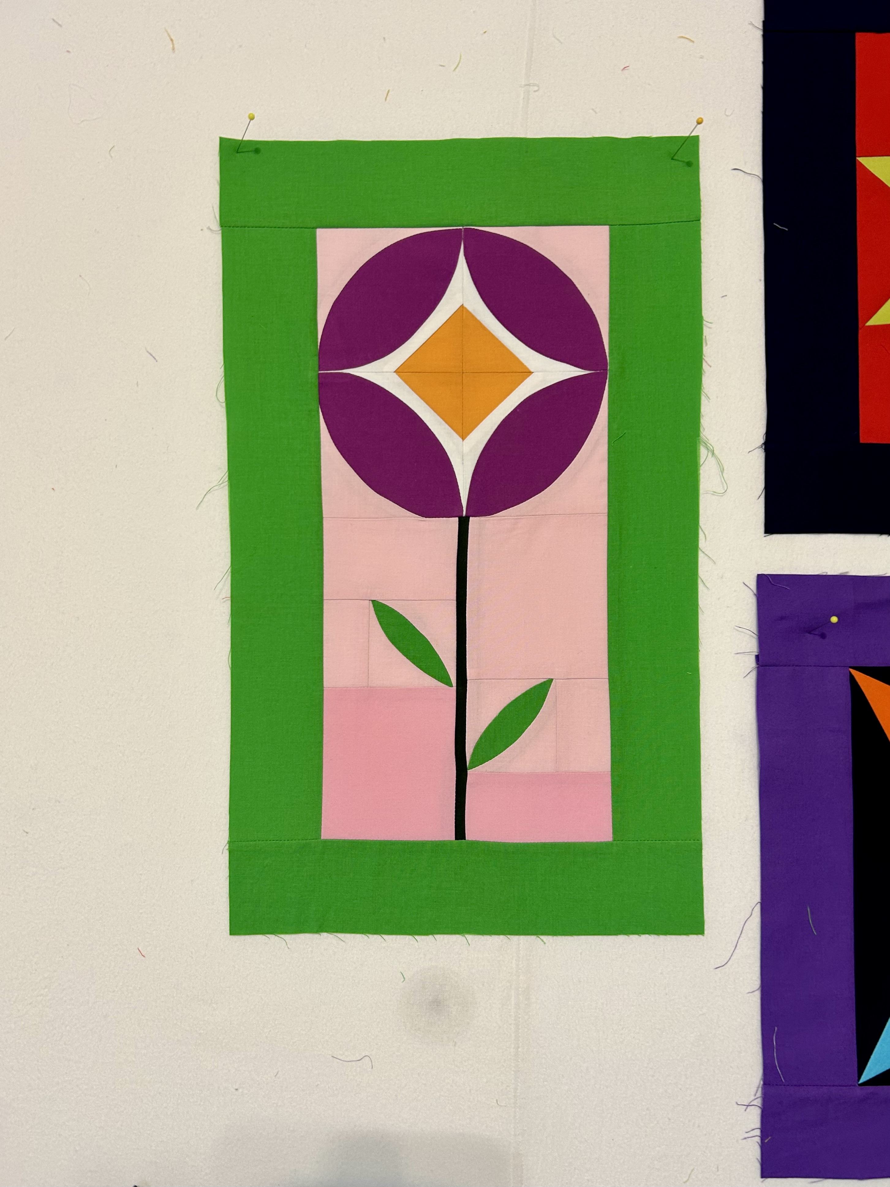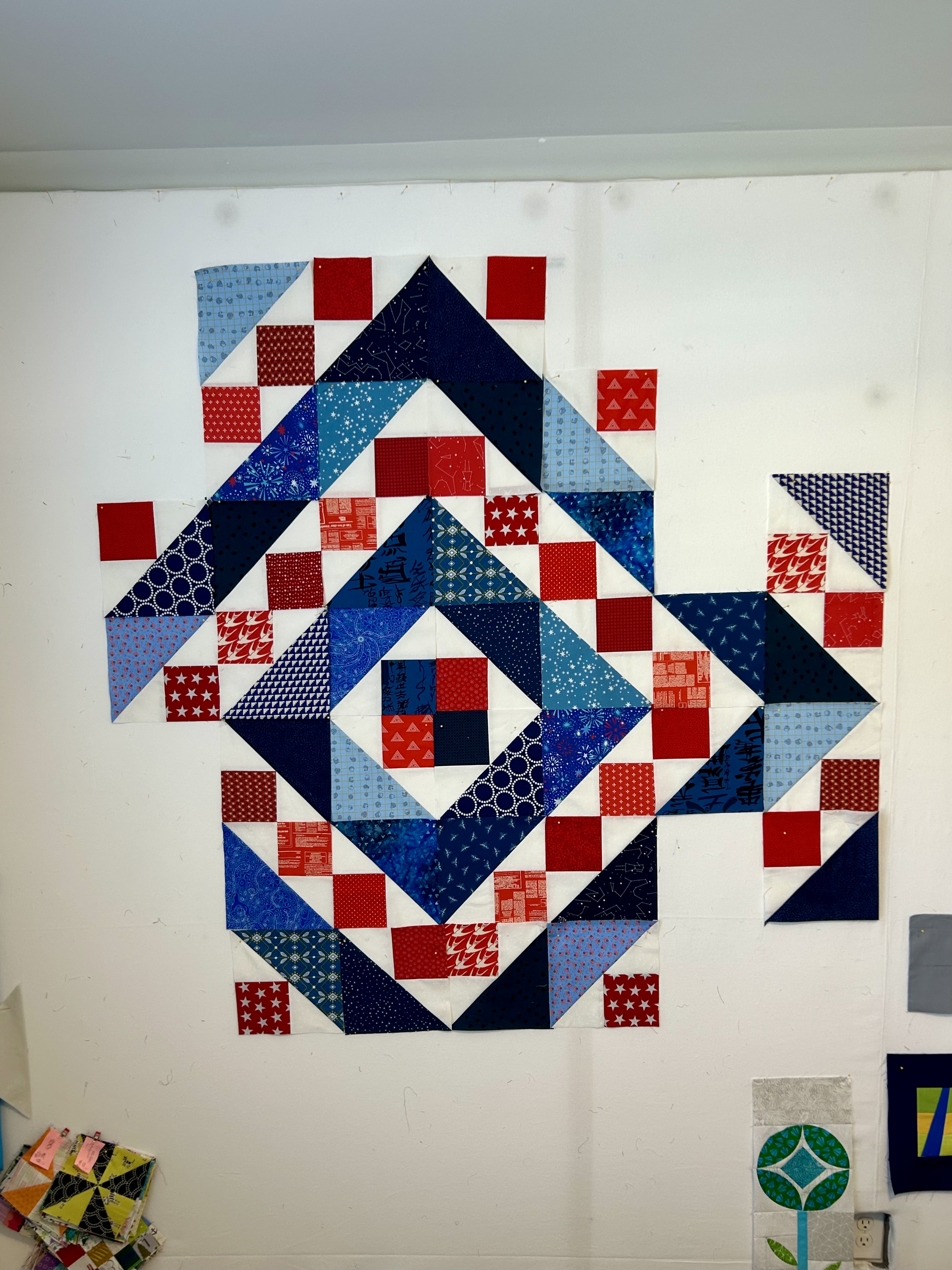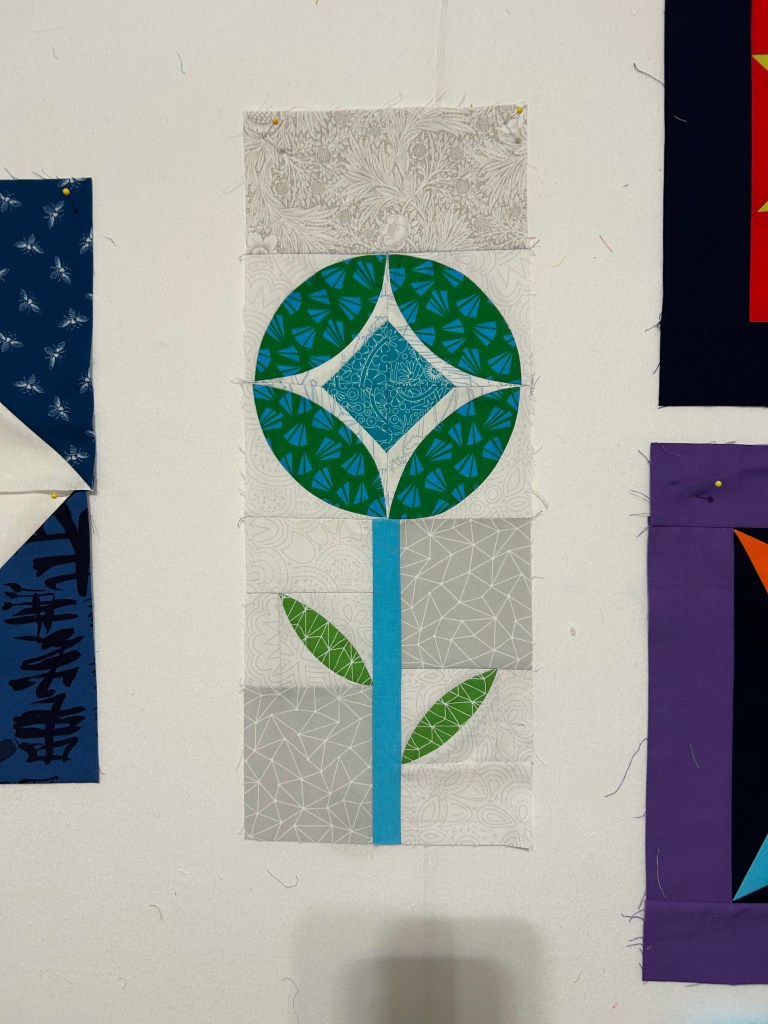Later today I’ll try the 3.5 inch templates and will use more colors. When combining blocks, one is meant to look for what kind of interesting shapes and color blocks emerge. It’s “improv,” of course.