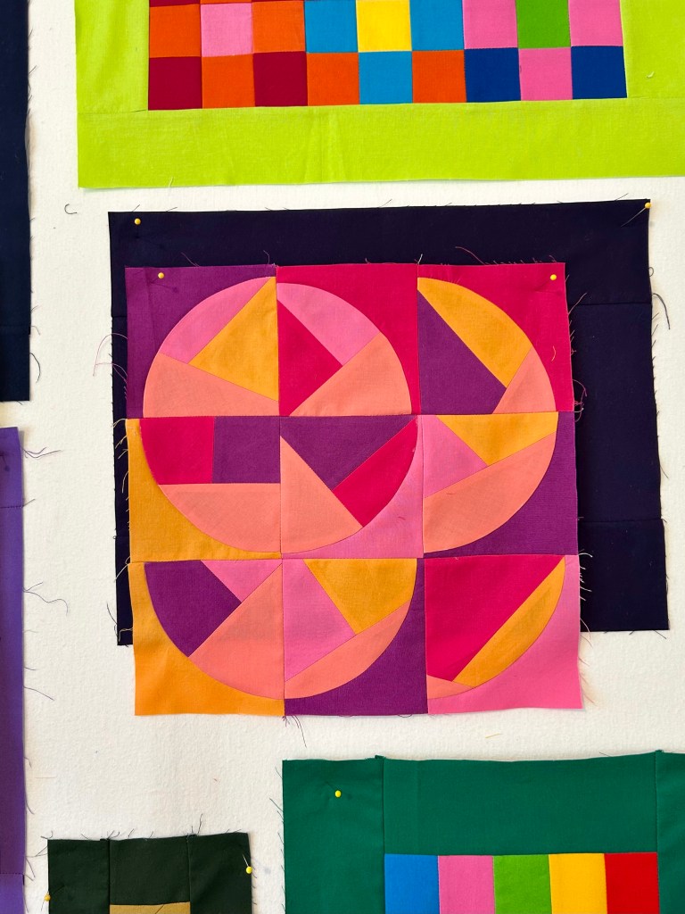 Meanwhile, the templates I ordered (a splurge) for the 4th block for my ongoing Tara Faughnan Blocks3 class arrived, and yesterday I made a trial block using the 4.5-inch templates. (I love the templates with their thinner outside piece.) The block idea, designed by guest designer Jen Carlton Bailly (bettycrockerass.com), is named “Shattered.” I used less colors than the designer used in her demonstration videos (we have 12 colors in a month’s palette) as this 4.5 inch block would make a bigger piece. It still felt incoherent to me, so I used circles that would calm my eye movement.
