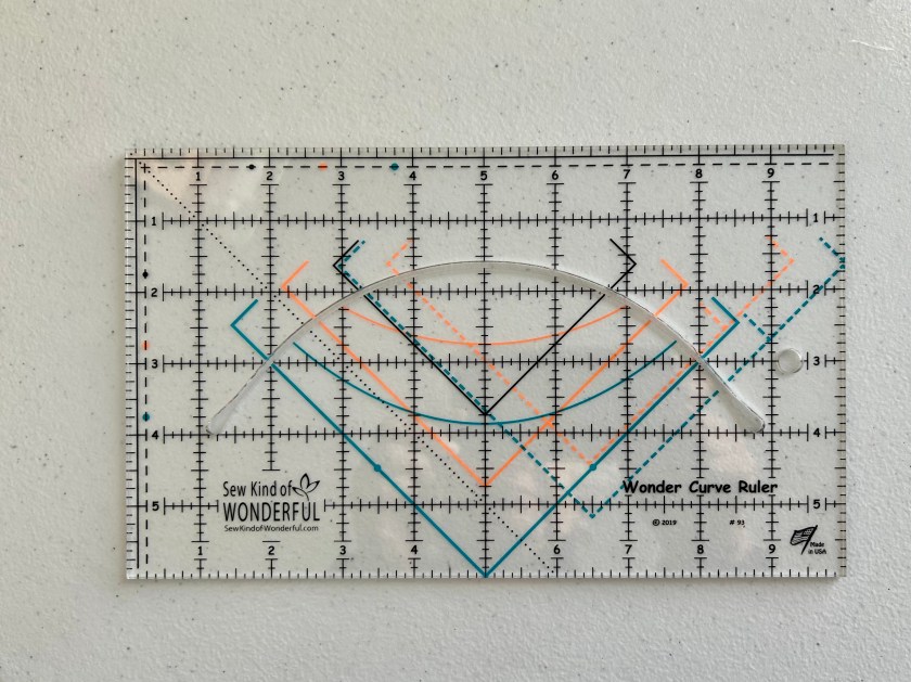 I ordered the ruler, but until a few weeks ago, it and the pattern waited for me as I moved from Maine to South Carolina and got reorganized here. Now I’ve been on a mission to use the rulers I have not yet trialed. The other day I pulled out this ruler and the pattern information as I still have that magazine. Here’s the ruler one uses to cut all the curves–and it does make that process easier, but there is a learning curve on how to use the ruler AND how to angle the cutter blade within the cutting strip.