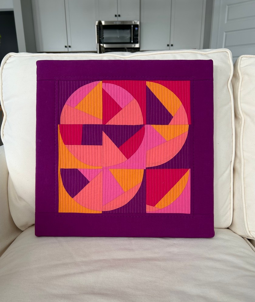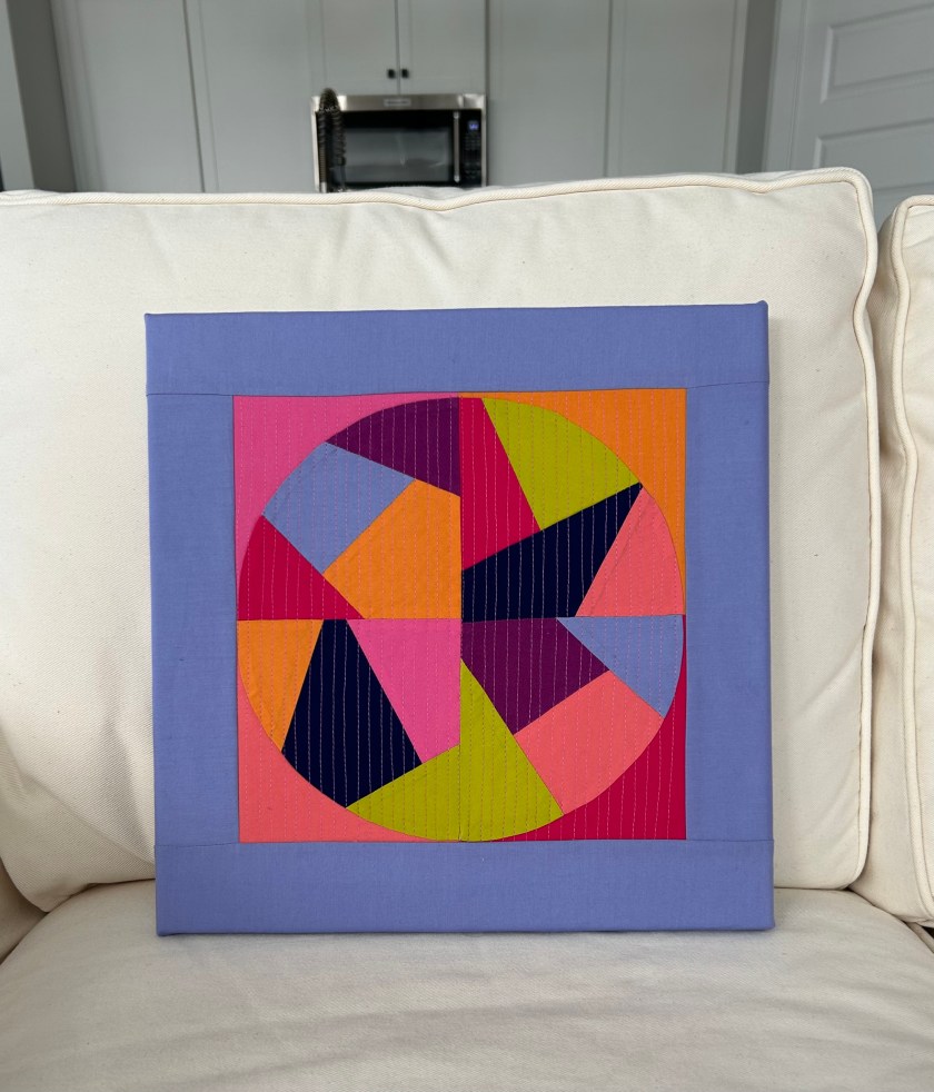 Here’s my first effort–using a 4.5-inch template. I wanted warm colors to play together. When laying out one’s blocks, one might look for what colors might group to please the eye, and/or what kinds of shapes can be found. I quilted with a soft orchid thread in matchstick lines, and hand quilted an outside line with a more or less matching thread as I didn’t want it to stand out and pull the eye away from the center. Matchstick lines don’t take away from a very graphic piece. Then I installed the piece on stretched canvas.