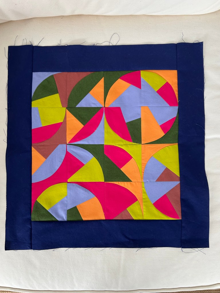 Month 4 of my Tara Faughnan online class, Blocks3, introduced the work of Jen Carlton Bailly’s “Make It Curvy” (bettycrockerass.com) block method, which involve her curvy templates in many sizes. These templates have a much narrower outside piece than, say, the Drunkard Path’s templates–which means one can make a bigger visual circle.