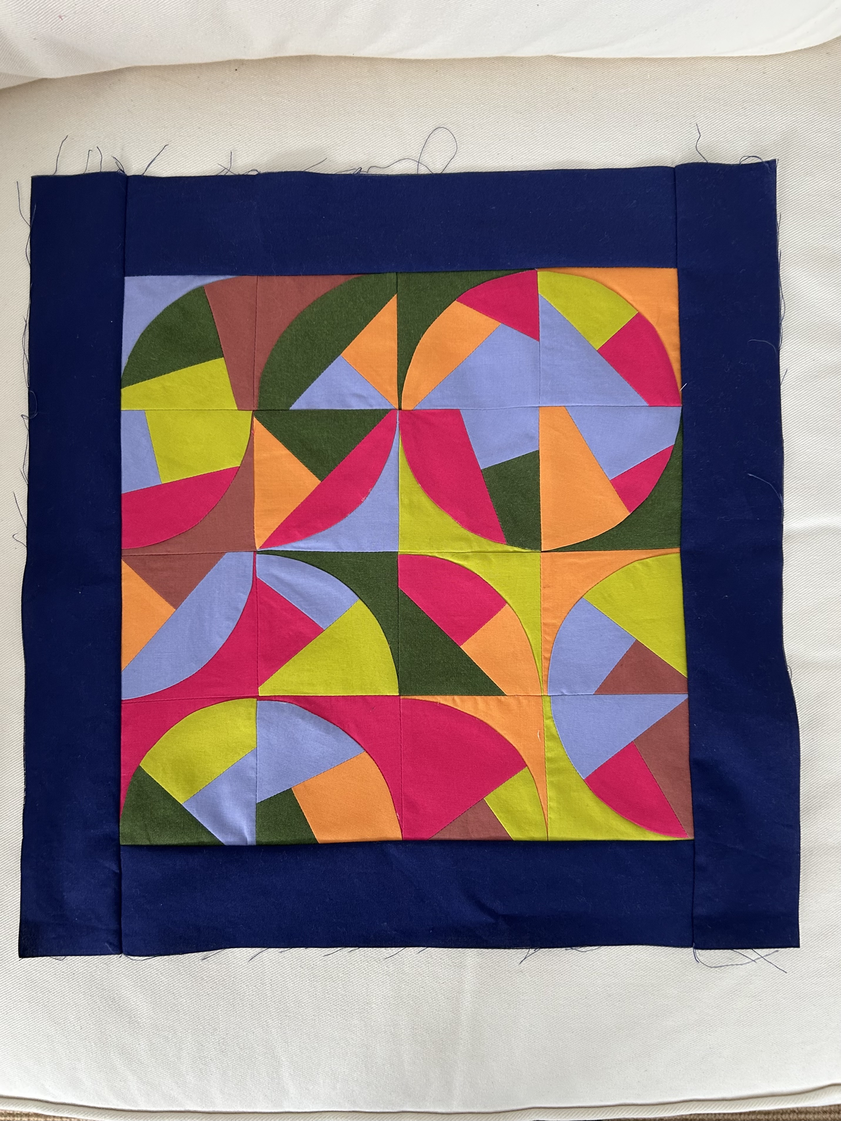 Month 4 of my Tara Faughnan online class, Blocks3, introduced the work of Jen Carlton Bailly’s “Make It Curvy” (bettycrockerass.com) block method, which involve her curvy templates in many sizes. These templates have a much narrower outside piece than, say, the Drunkard Path’s templates–which means one can make a bigger visual circle.