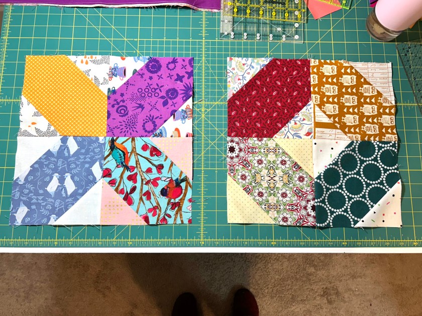 Rachel LaBour of the “Stitched in Color” blog recently shared this idea for scrappy quilts. The block parts are 6 inches finished (cut at 6.5 inch squared), so this block will make a big 12-inch block. I think it may be perfect to use up several piles of bigger scraps I have (smaller than a fat quarter) and need to use. That’s a “yeah” for me! I don’t really want to cut these pieces into smaller squares as I already have BINS of squares.