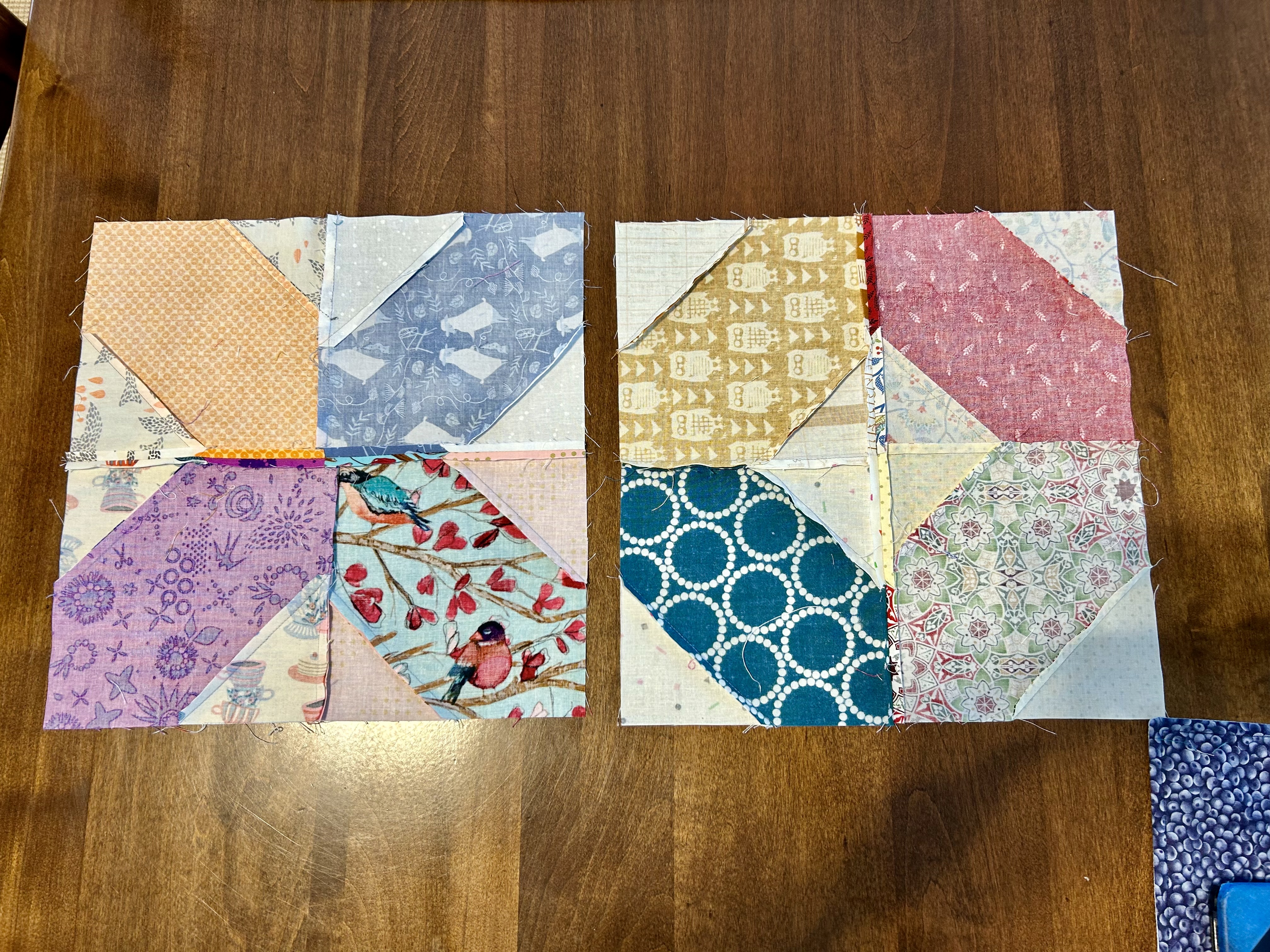 I turned my blocks to the back to figure out how best to press them so the 4 sides would go together with seams butted. The “x” and “circle” blocks would have different pressing. The “x” block works to press in a circle, but the “o” block works to press 2 blocks out and 2 blocks in. Here’s a picture to help you. I think one could move these blocks around when sewing blocks together to line up the seams so they butt–which might change any placement orientation you wanted to have in terms of fabric pattern.