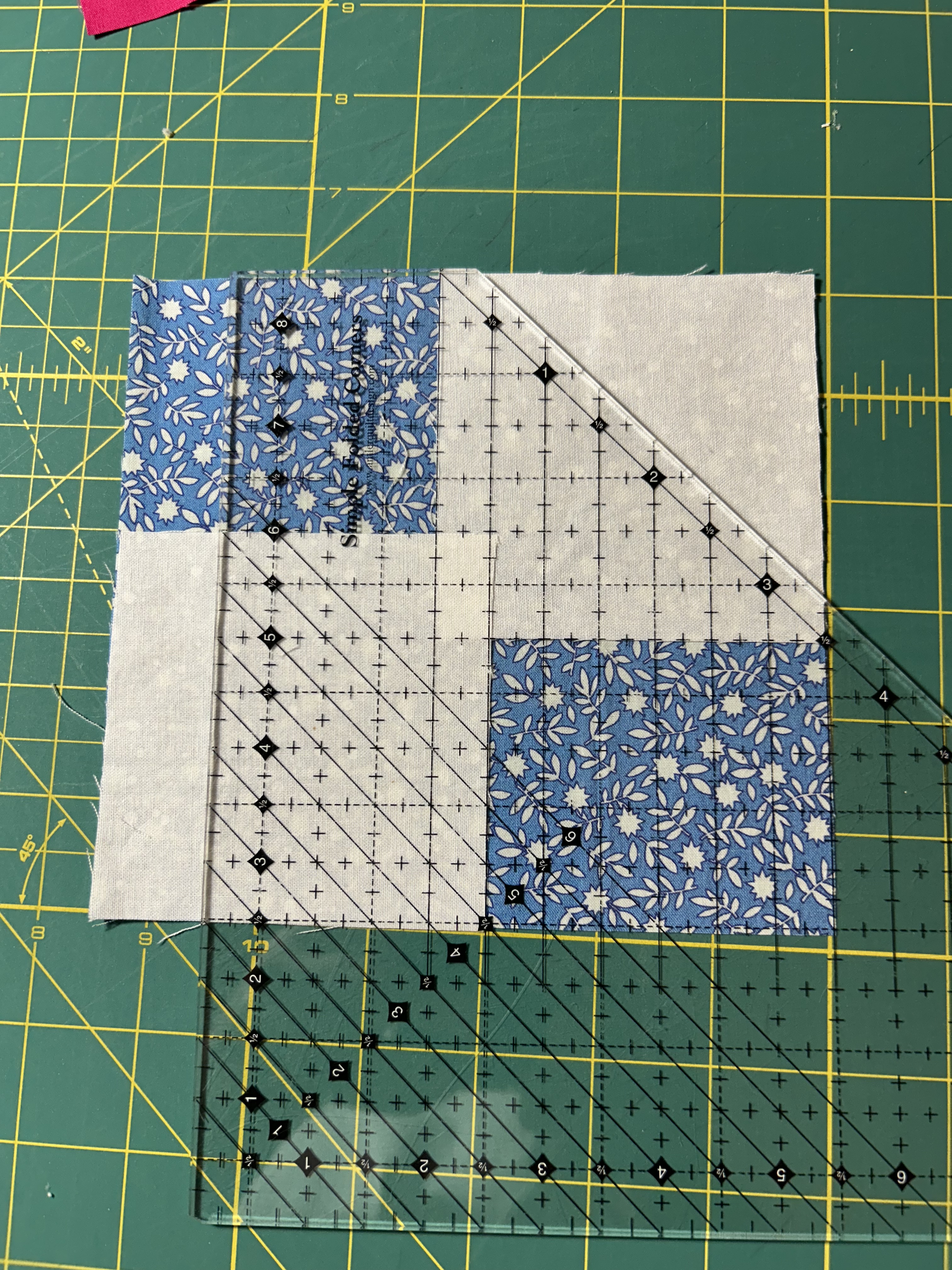 I’ve been using a Simple Folded Ruler to cut the corners from 3.5-inch squares placed at diagonal corners–which means I do not have to draw a sewing line on these squares, sew, then trim. (As I said above, I have a whole bin of 3.5-inch squares including this one in neutrals.)
