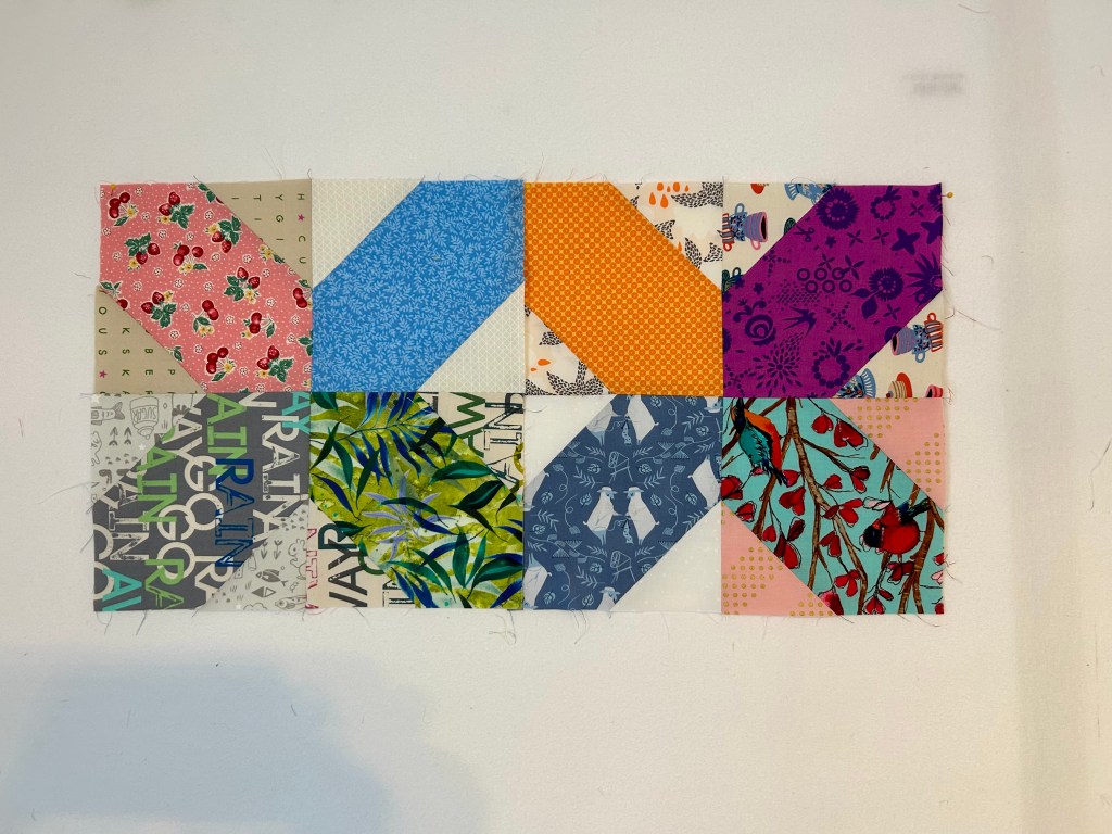 The block is easy and quick–from cutting to sewing. So I’ve been playing with the “x” one as a leader/ender project and with the goal of making a donation quilt.