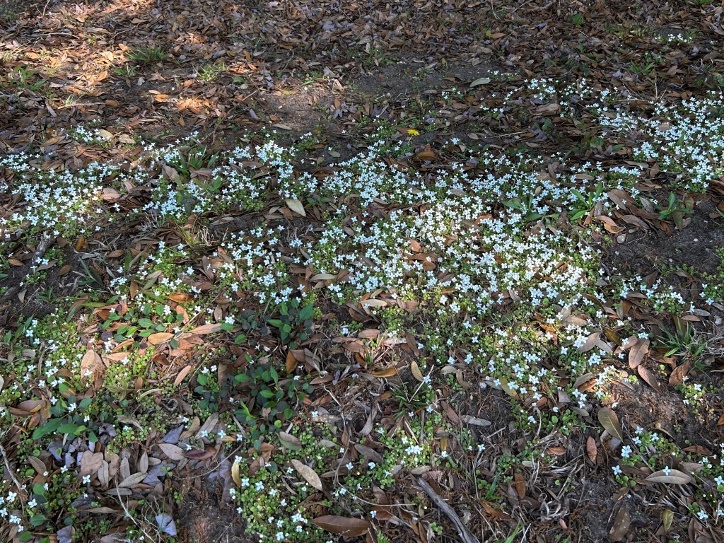 The tree leaves are out, and there is new leaf growth in many plants, like my roses. The azaeleas are also now blooming, or about to bloom, as are the early spring blooming trees like the redbuds and the Tulip Magnolias. Along the edges of the sidewalk where I frequently walk my daily mile, all kinds of wild flowers are blooming. This one is called “Innocence,” according to my plant identification app (Rubiaceae, or Houstonia procumbent).