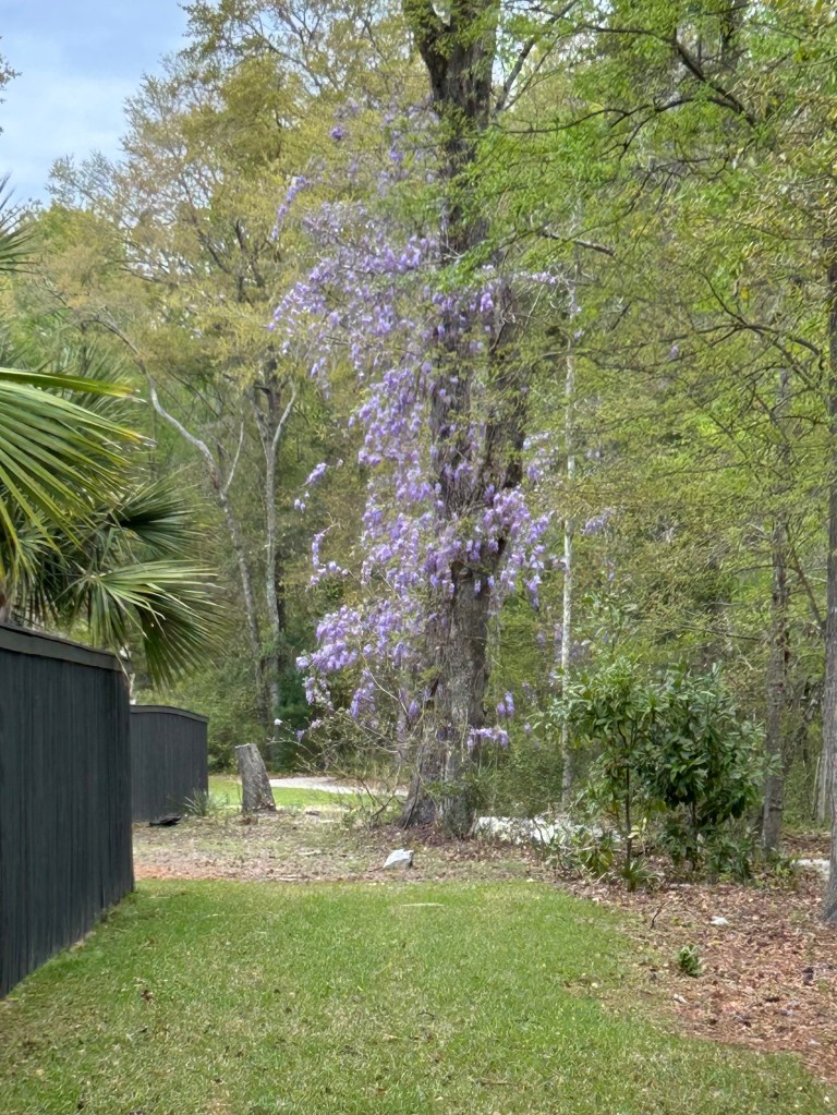 The Wisteria is in full bloom in the woods all around us. Here’s a picture from my neighborhood, and there is another tree I can see from my house that has Wisteria wound around it. Beloved Neighbor says it is fragarent, and it is, for me, up close. My nose doesn’t always smell as powerfully as it used to smell.