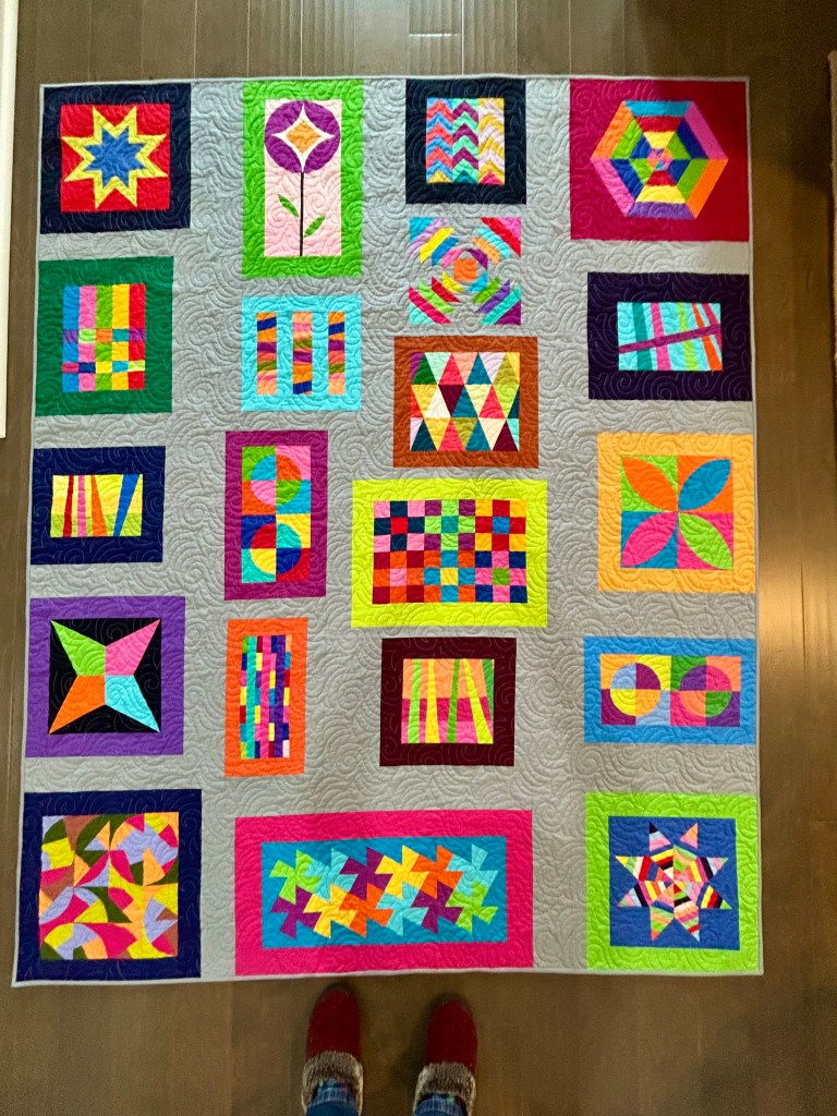 Here a recent improv quilt: “Improv Blocks” made from all the blocks made in an earlier Tara Faughnan “Blocks” class.