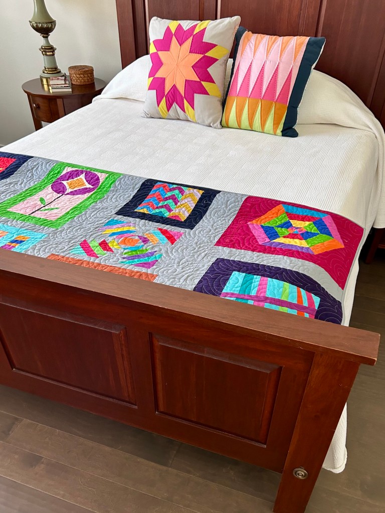 “Shape-Shifter” measures 65 by 80, so she is perfect for a long bed or a long person. And did you know that if you “accordion fold” a quilt top for your bed you can just reach out and grab the edge to pull it over you if you are cold.