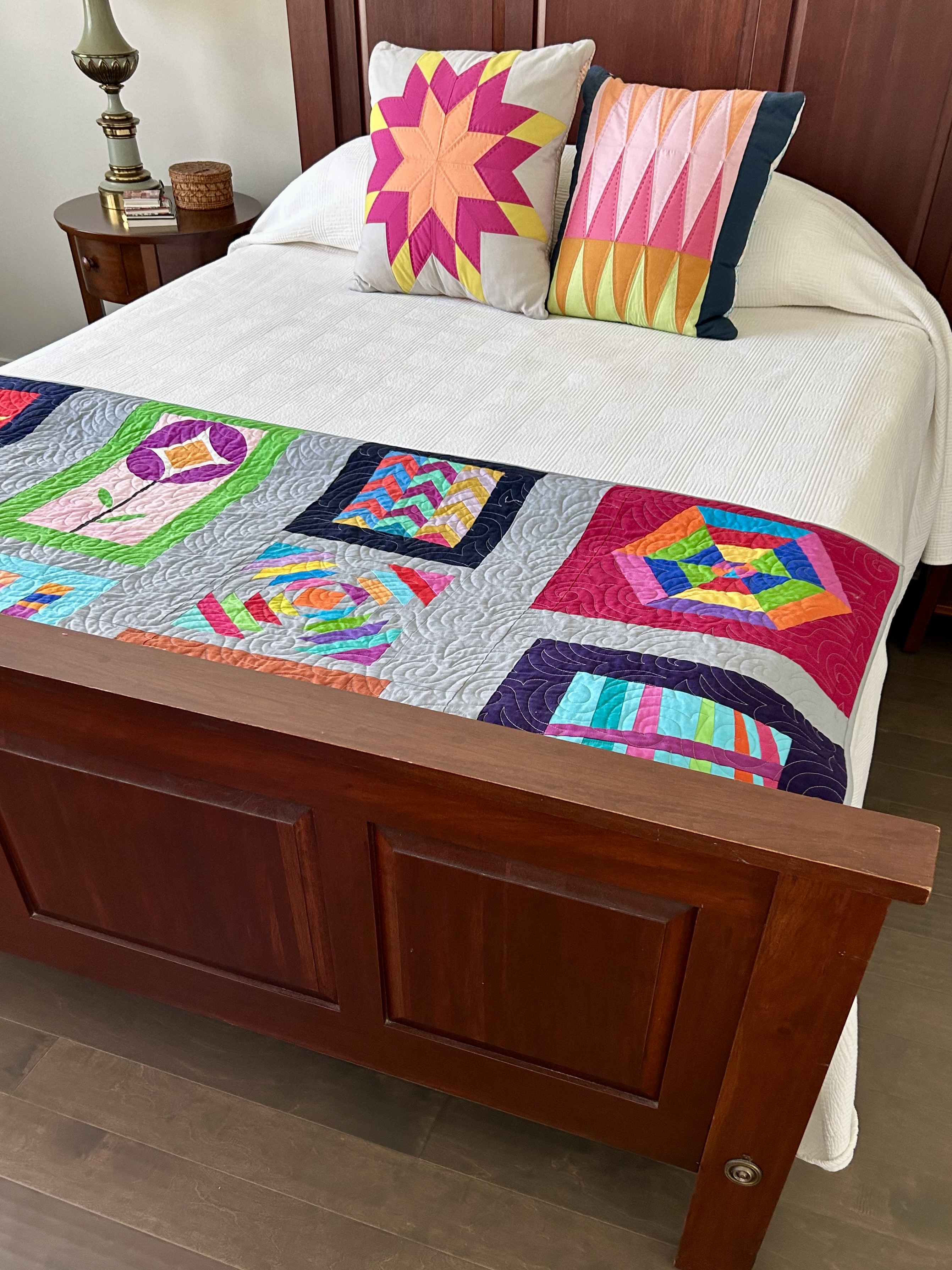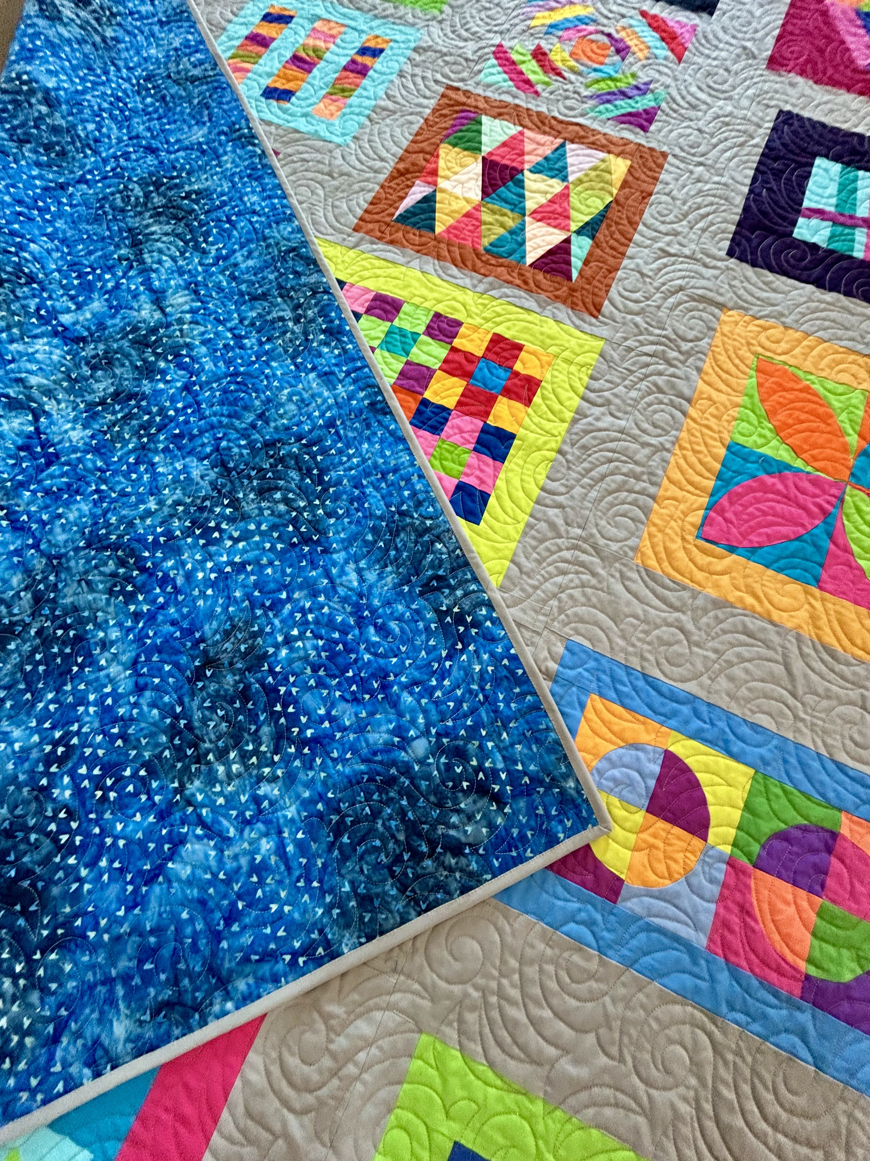 Here a recent improv quilt: “Improv Blocks” made from all the blocks made in an earlier Tara Faughnan “Blocks” class.