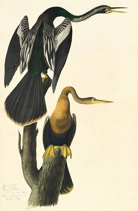 The Anhinga, also known as the “snakebird” or “water turkey,” is a large, dark water bird with a long, thin neck and a pointed bill, found in warm parts of the Americas. It hunts fish by spearing them underwater and swims with only its head and neck visible, which resembles a snake. After hunting, it spreads its wings to dry its waterlogged feathers, a behavior that helps it warm up and is often mistaken for a cormorant.
