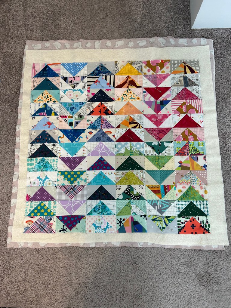 …and which I used to make this small piece that I quilted with straight lines on my Janome. Each XO block made two paired half-squares when trimmed. I suspect it will become a table topper. I normally don’t save triangles like these, but these were too large to ignore.