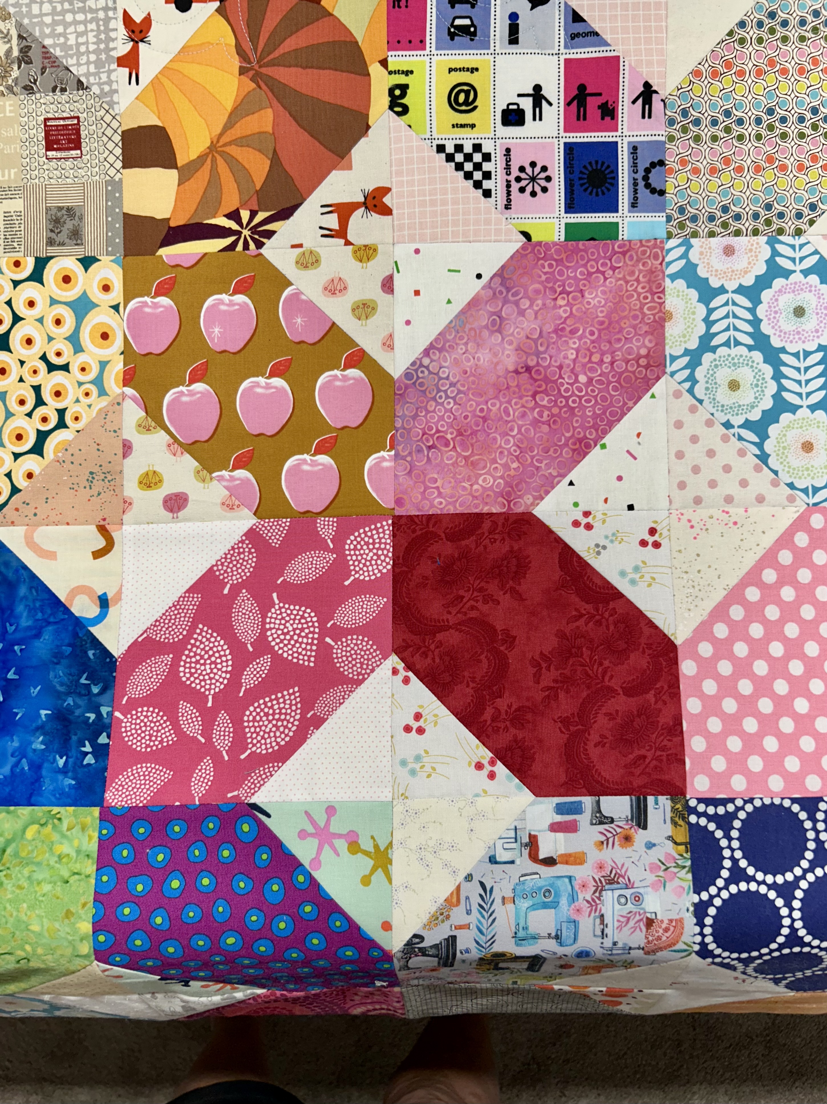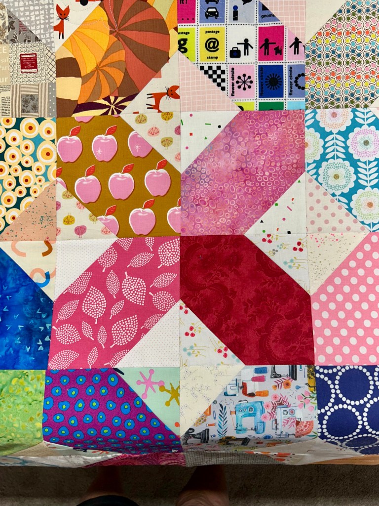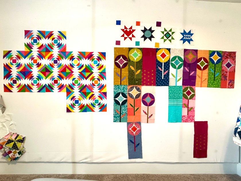 That little bit of stacked fabric on the bottom left is a leader/ender donation quilt ready to sew together–when I have design wall room again to lay it out. And the stars on top of “Flower Pop” are blocks made with Leila Gardunia’s “Scrappy Stars” patterns which are so fun to make,
