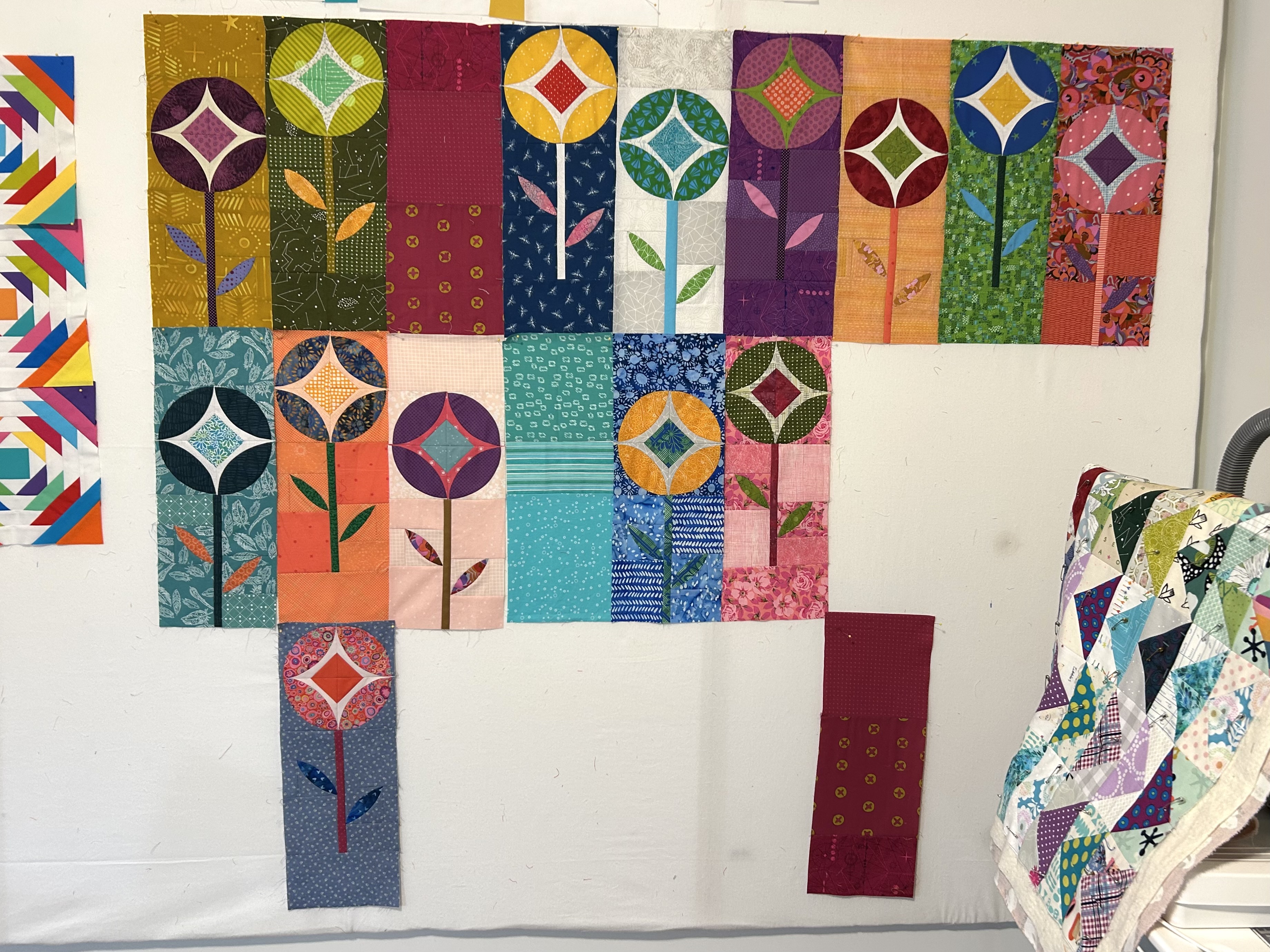 “Flower Pop” is made with a speciality ruler from the Sew Kind of Wonderful quilters. It is fiddly with a big learning curve, but I’ve got that down now and the blocks are going faster as a result. It will be three rows of 9 blocks, which finish at 7 inches by about 19 inches. Have you noticed that flower blocks are all the rage at the moment?