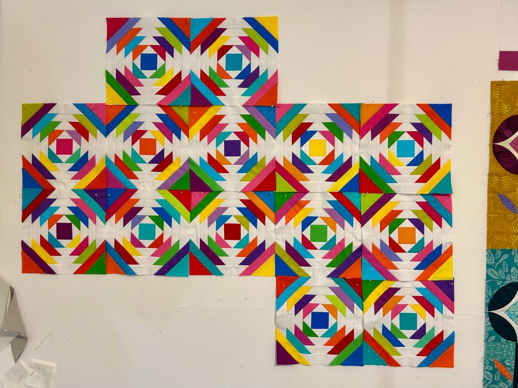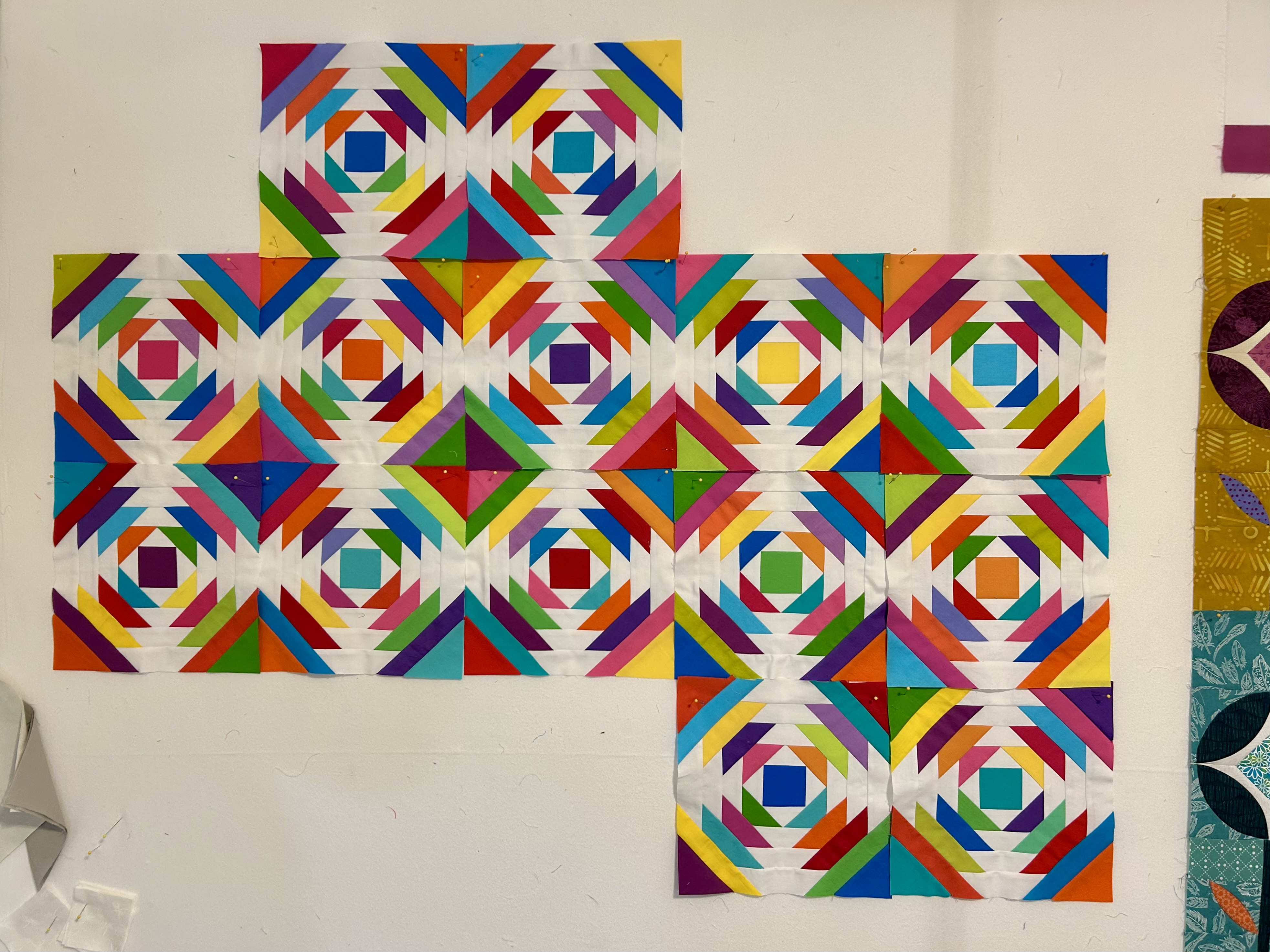 The pineapple ruler blocs will finish at 10 inches, and I’m thinking 6 by, maybe, 6 or 7 long–or 60 by 70. It’s using up a lot of my solid stash “bright” fabrics. I didn’t see that the block would make circles, which is so fun.