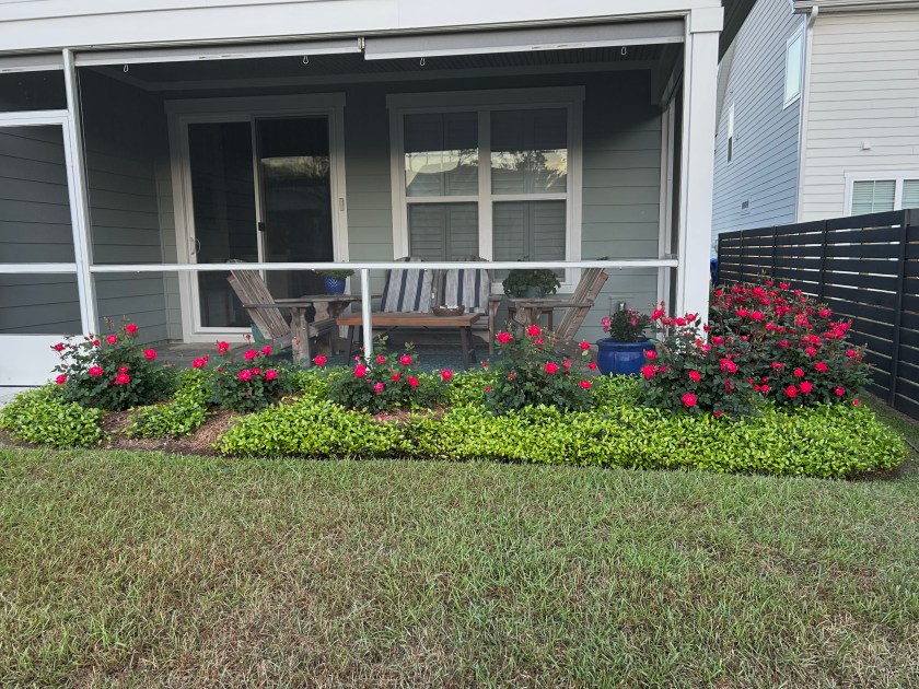 Beyond the front porch is a bed of Drift white roses and hollies that came with the house that are now thriving. The roses are covered with bloom buds, but that will be a picture for another day.