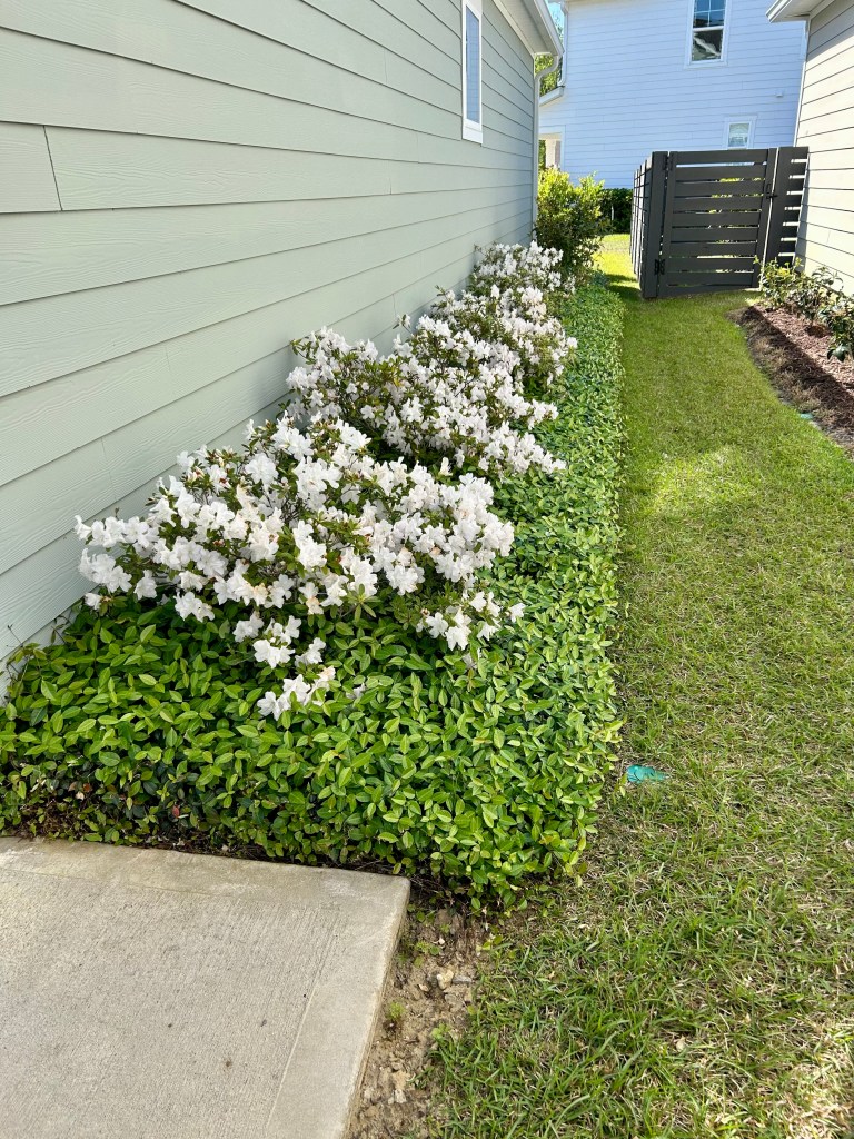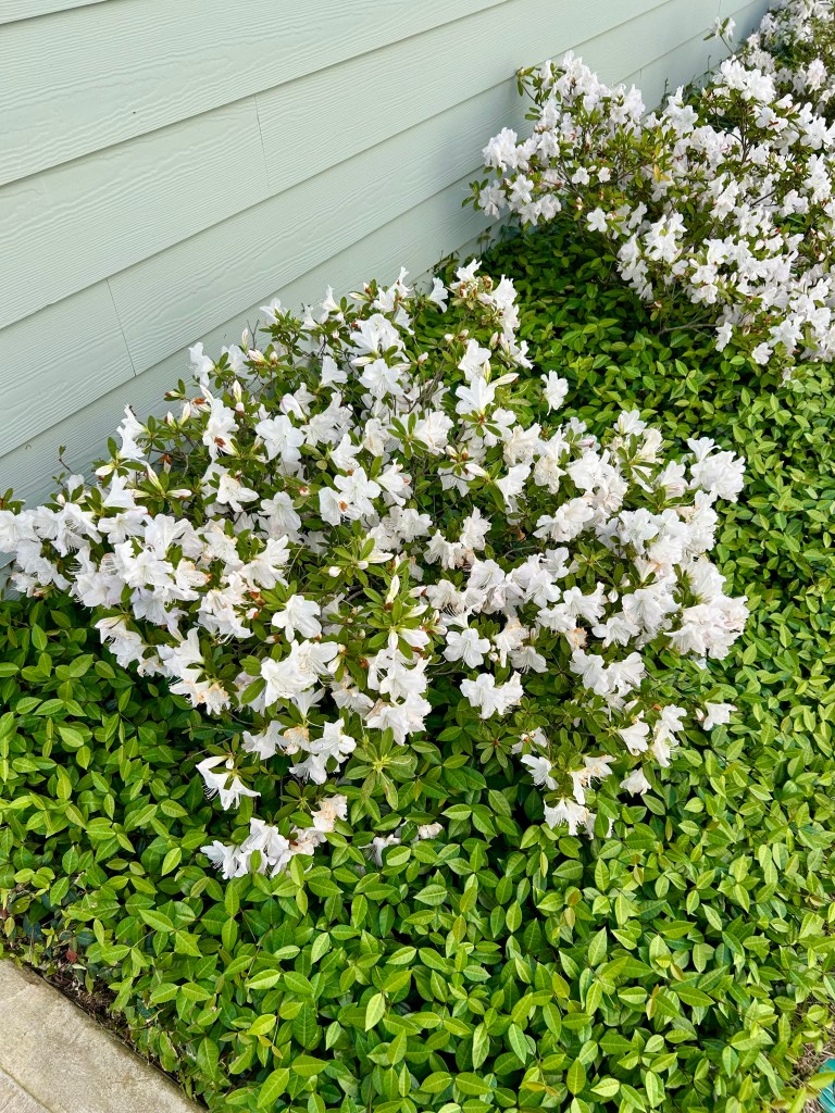 The white azaeleas on the side of the house are so pretty this year. They were transplanted from the front of the house as it was way too hot out there for them. And they have struggled as the soil on the side of the house is very poor. But two years of fertilizer and nutrients is showing, despite the ongoing drought that really needs to stop–without jinxing us with the dreaded “H” word.