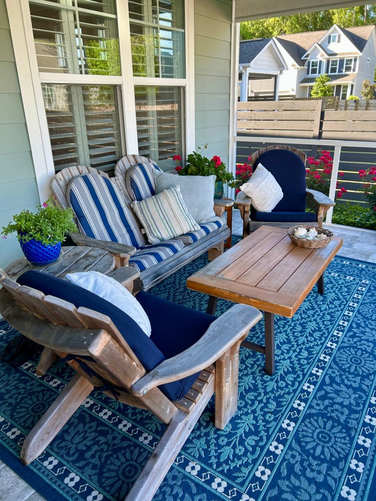 It took most of yesterday to clean the screened porch, which involves washing the pine pollen drenched rug, washing winter mold from the blinds that can be pulled down to screen the porch for privacy and from the afternoon sun, washing pillows and cushions, and, of course, washing the floor.