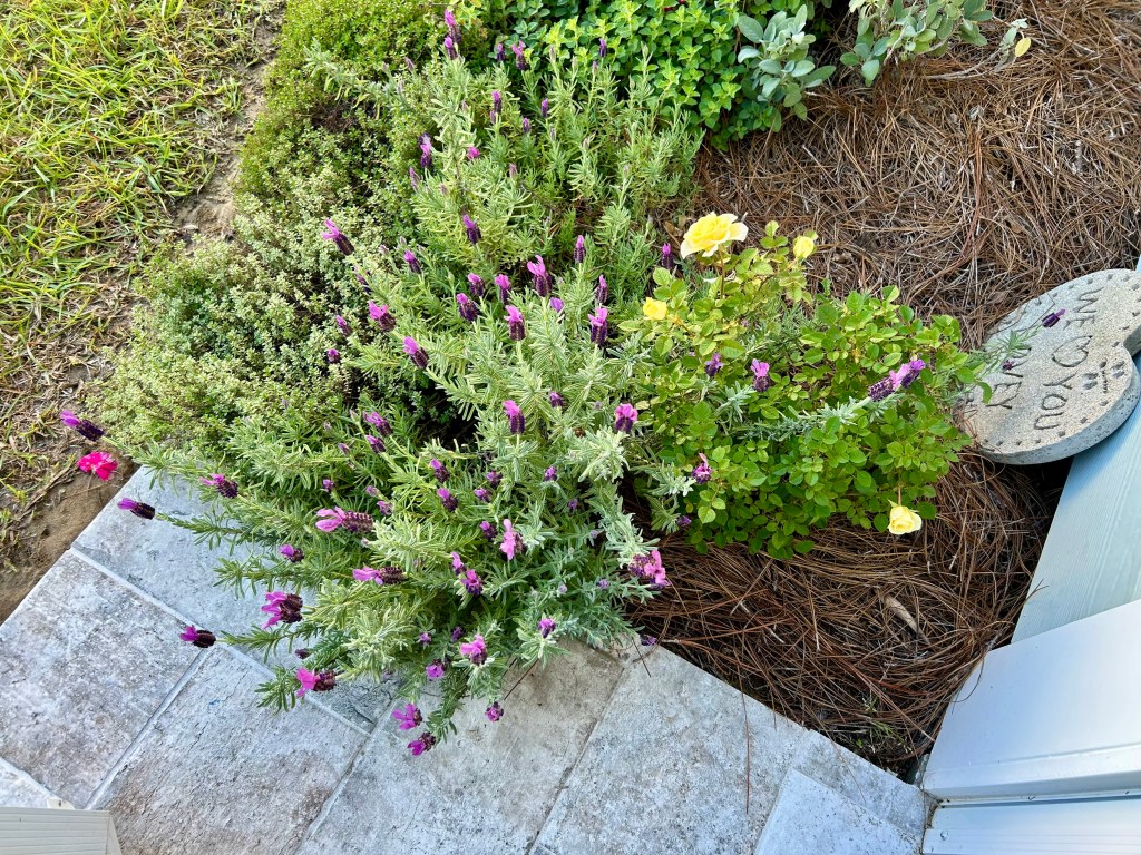 The lavender and the yellow miniature rose are both blooming right outside the back porch door. They are next to my kitchen garden herbs.