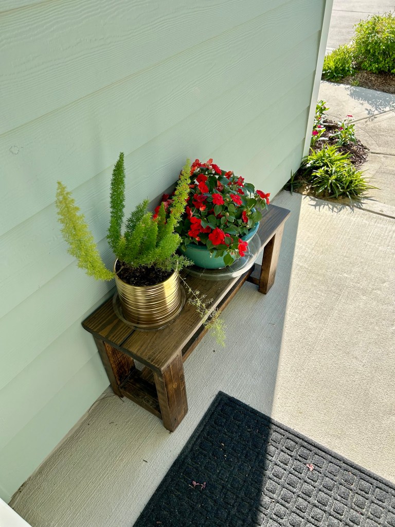 My little front porch has a bench now, made and gifted by my beloved neighbors. Earlier this spring, I got a nice pottery pot for Impatient plants and repurposed a pot gifted to me at Christmas that now holds a Foxtail fern.