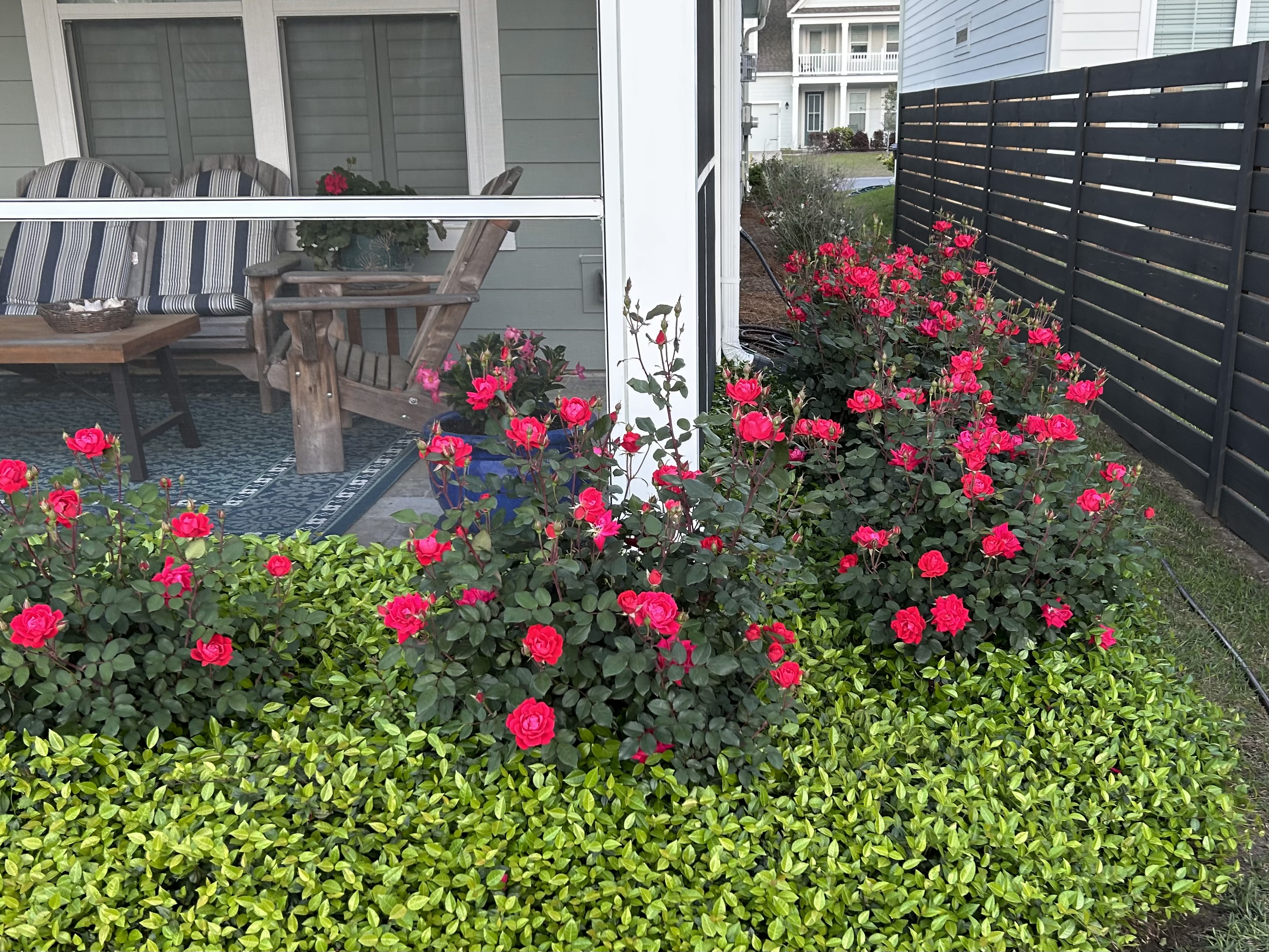 Beyond the front porch is a bed of Drift white roses and hollies that came with the house that are now thriving. The roses are covered with bloom buds, but that will be a picture for another day.