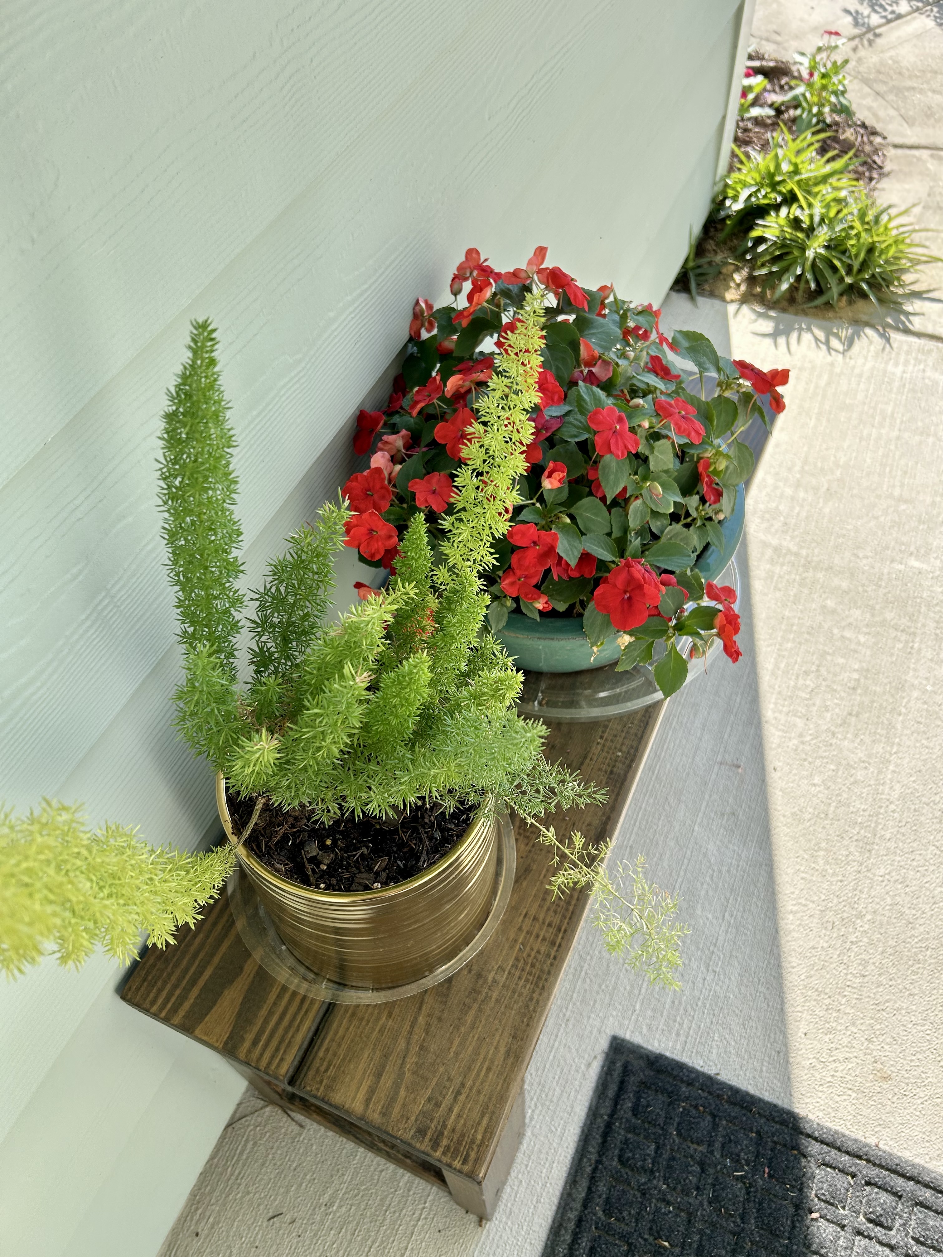 My little front porch has a bench now, made and gifted by my beloved neighbors. Earlier this spring, I got a nice pottery pot for Impatient plants and repurposed a pot gifted to me at Christmas that now holds a Foxtail fern.