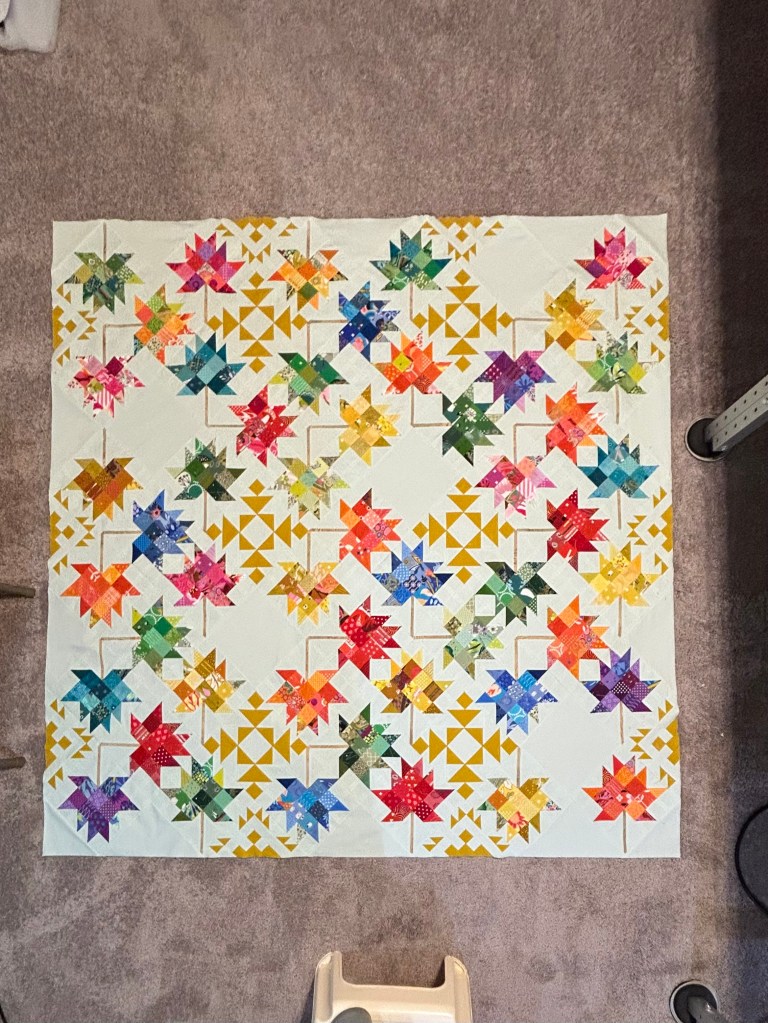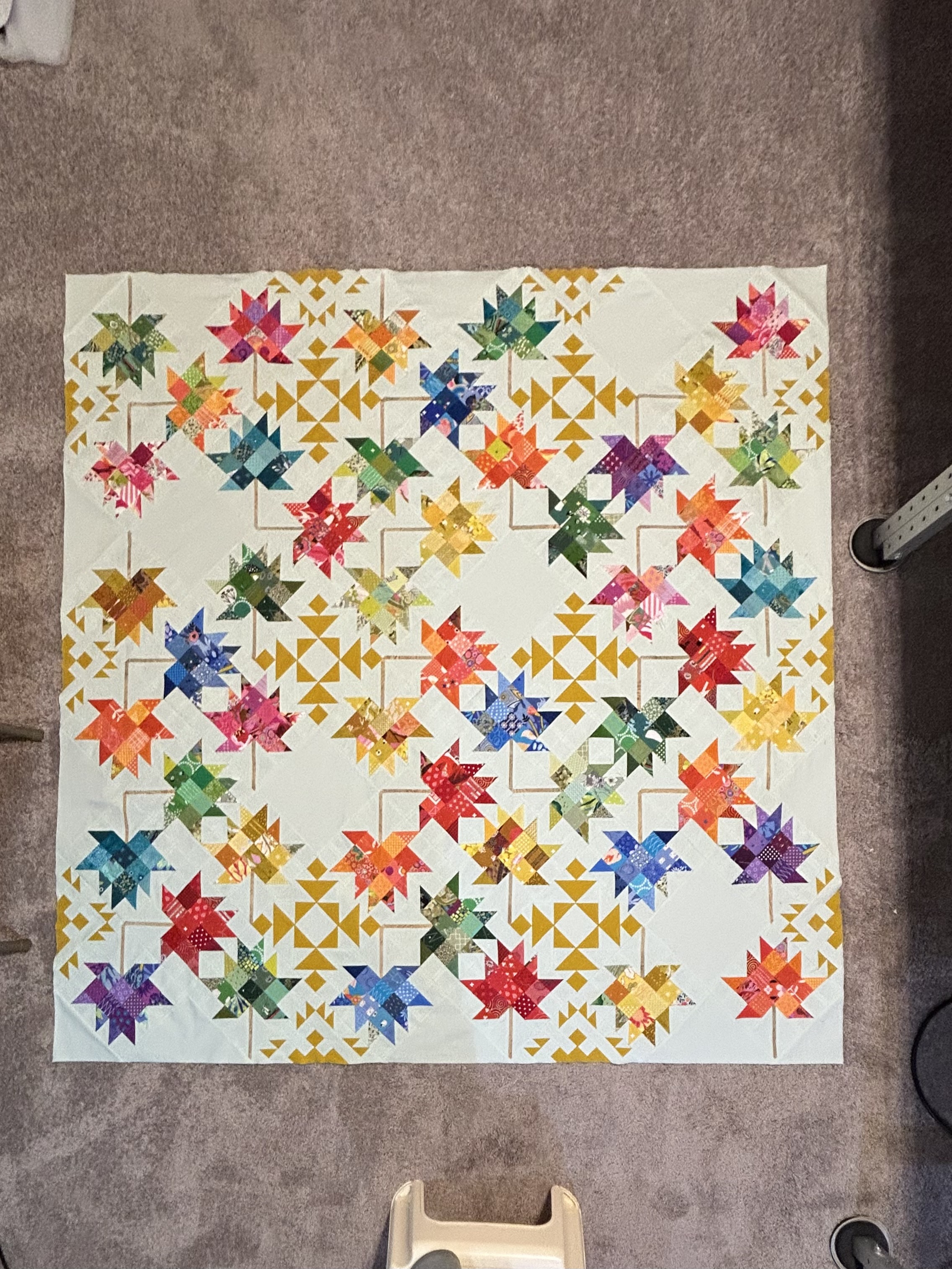 I finished the quilt top for “Under the Maple Tree,” a Rachel LaBour’s Stitched in Color blog sewalong. The perfect backing fabric finally got here–delayed due, perhaps, to the slowdown at the airports during the shutdown. It’s a Tilda fabric. Yesterday I found a fabric for the binding locally as I couldn’t find something I liked in my stash. This quilt was a lot of work, fun though that was, so I wanted the backing and binding to really “go” with this top. The leaf blocks are all from my scrap stash.