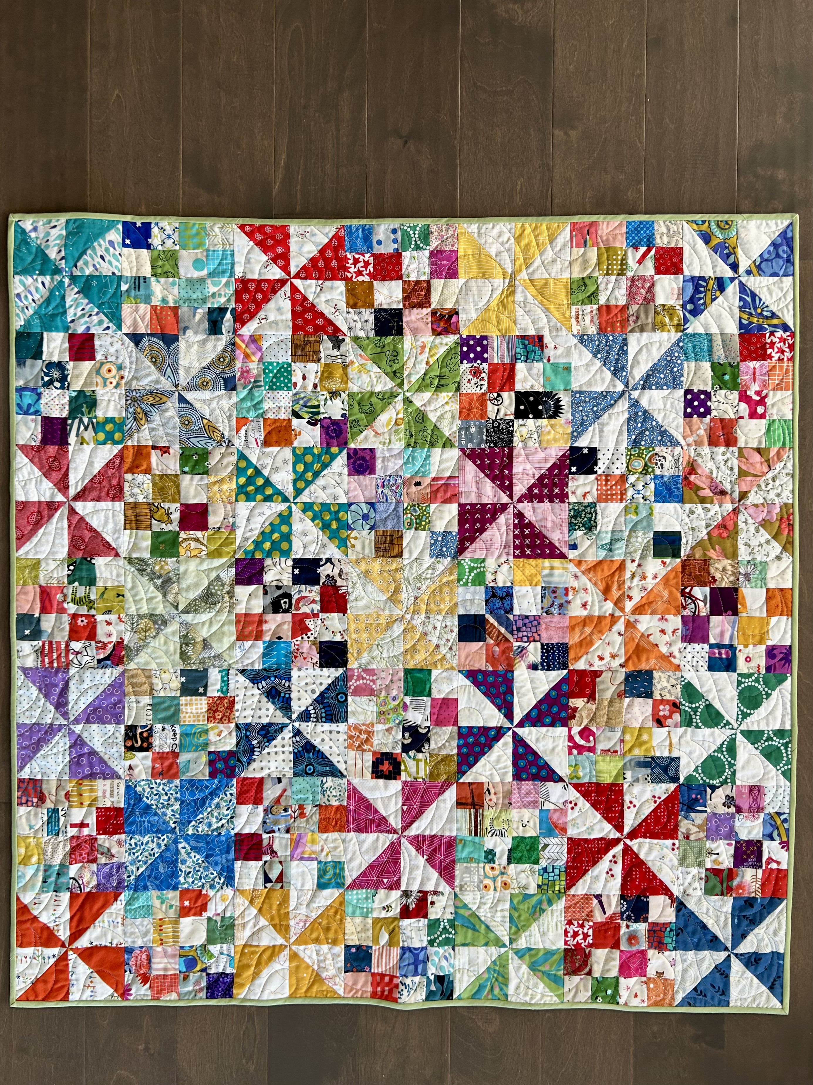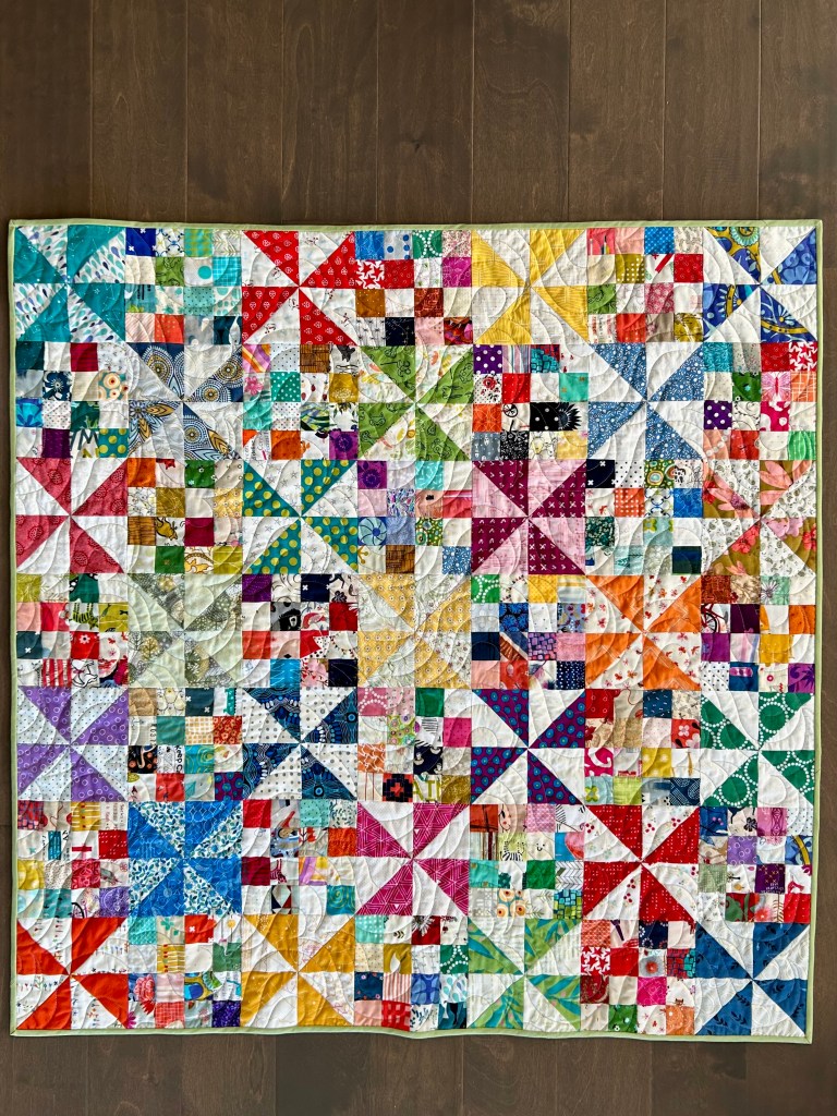 This little no-name donation baby quilt–made as a leader/ender with my 2-inch square bin and half-square triangles cut from scraps–is done. The pattern is from Bonnie Hunter’s free selection on her blog. It’s “Patches and Pinwheels.”