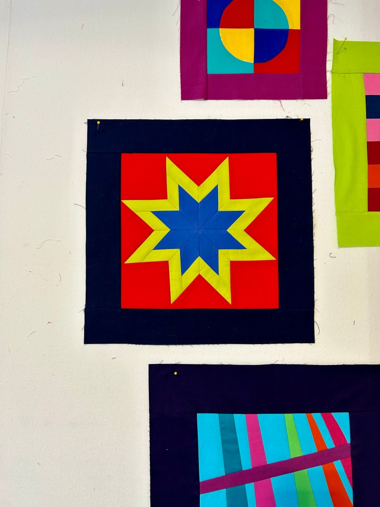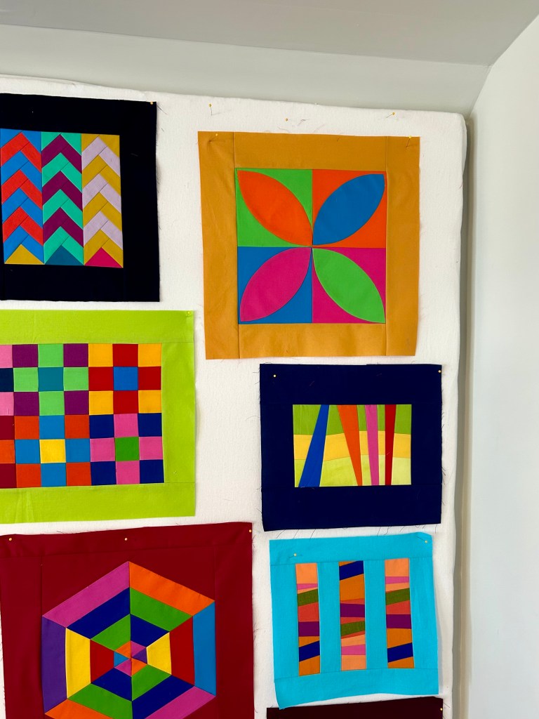 Me, I’m using the templates she has provided. And I started with the 6-inch version to trial the block, which I added to my collection of quilt blocks made with solid fabrics on the design wall: