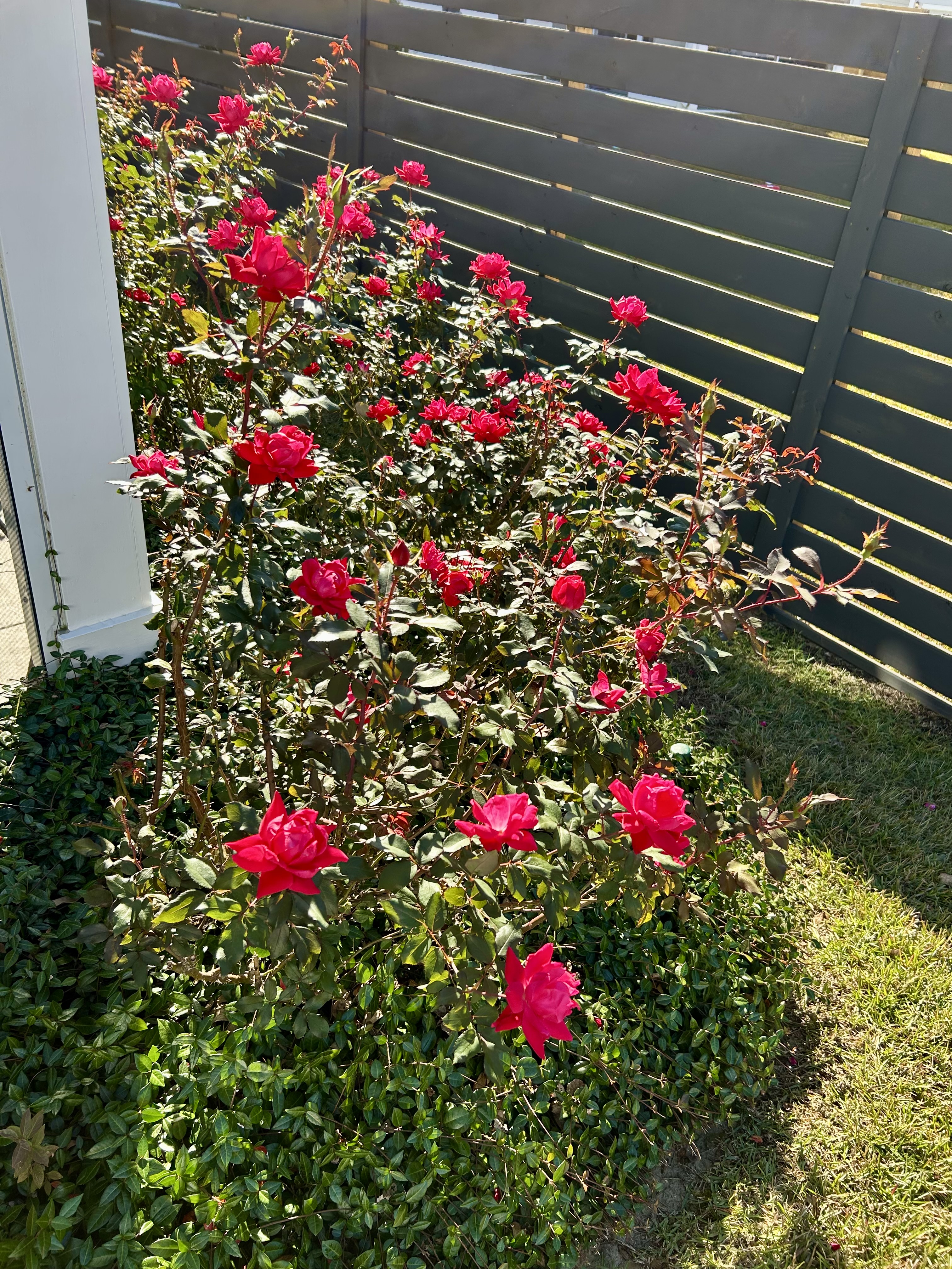 We’ve had temps dropping into the freezing area these past two nights, so it’s been time for me to seriously undertake the outside late fall cleanup chores. The red roses have survived the cold though, so I have not had the heart to cut them back.