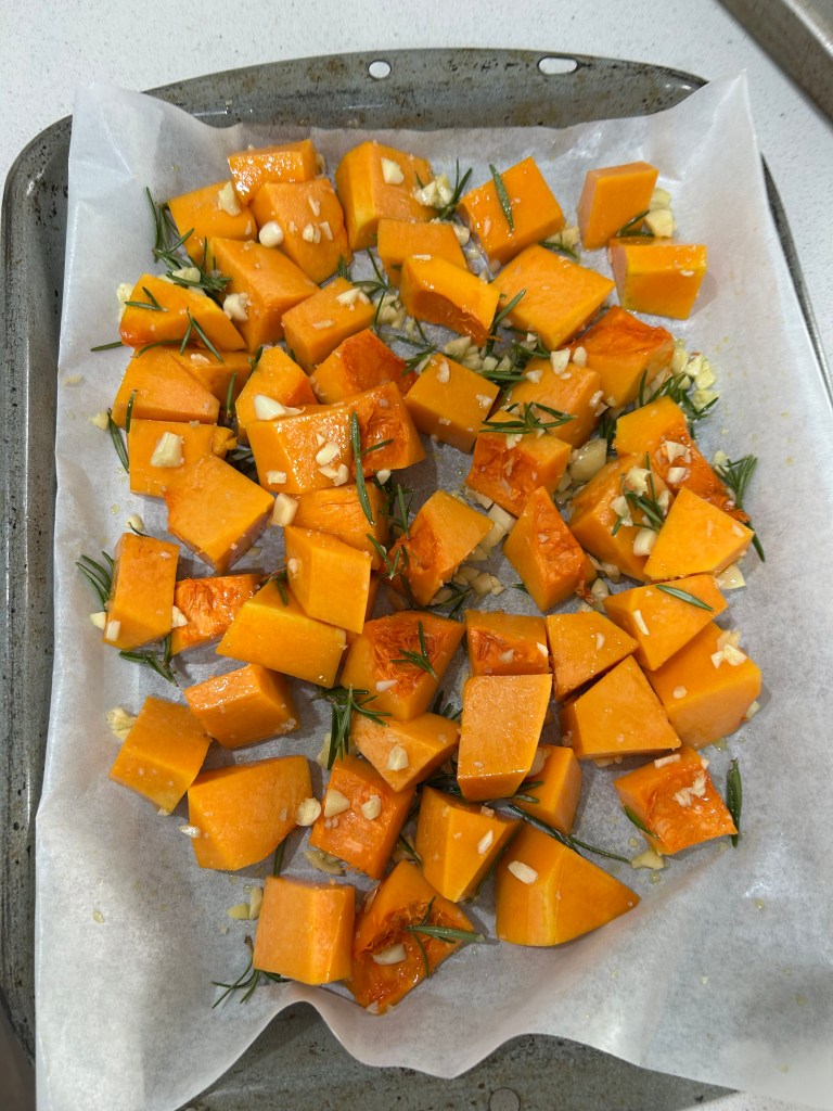 One of my favorite meals is best done in the fall when the butternut squash is nice and ripe. I cut one into cubes, add lots of chopped garlic and fresh rosemary, some REAL olive oil (not the kind with mixed seed oils added), and a bit of rough salt. I roast on a fairly high heat (375 or so) until the squarsh starts to carmelize a bit–which makes it so so sweet. I usually turn it all over once with a spatula as the bottom will burn if you don’t. Don’t cook it too long as you don’t want it to get mushy.