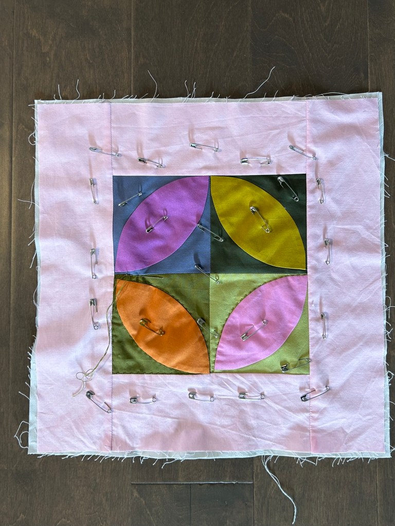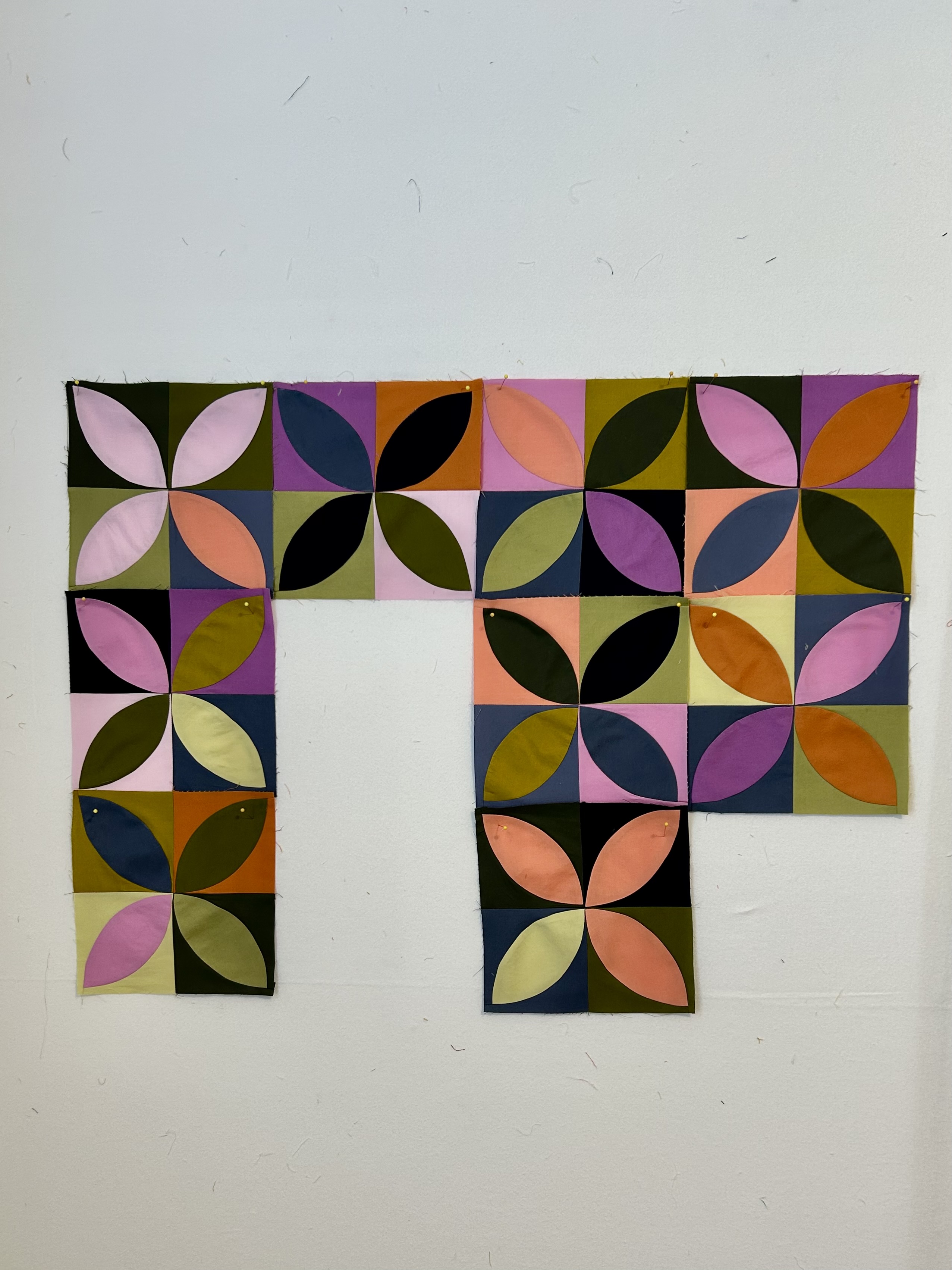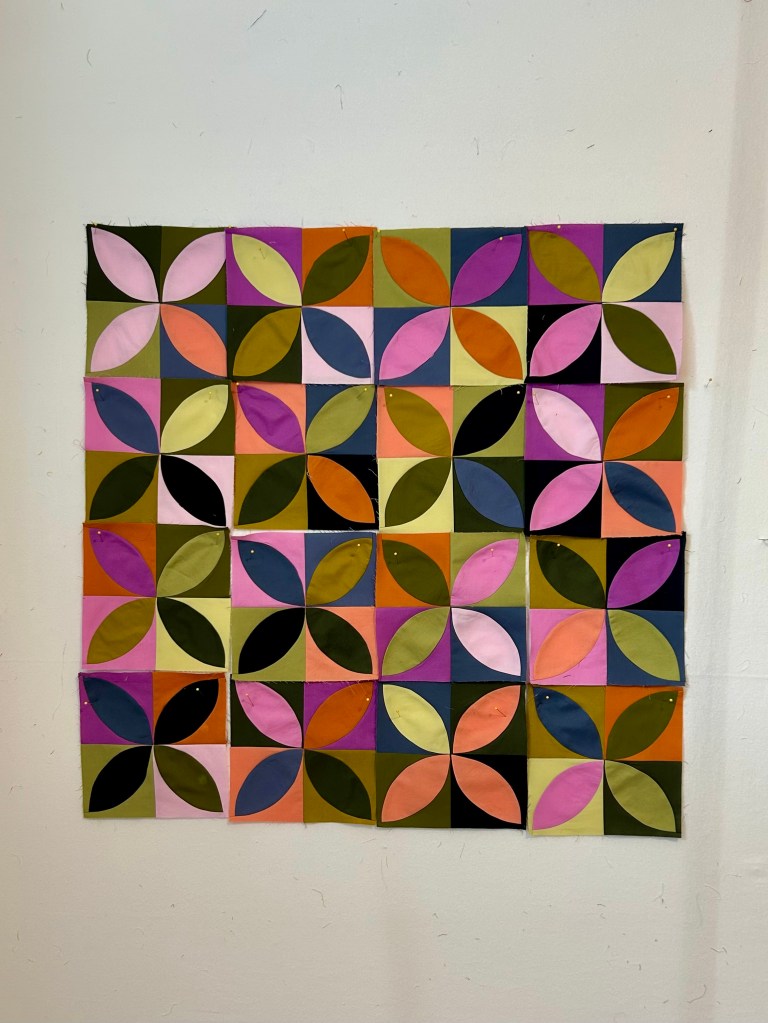 What interests me also is the pattern where two big blocks come together and form a circle. So I made one of those which I’m now hand sewing and will put on stretched canvas if it comes out ok.