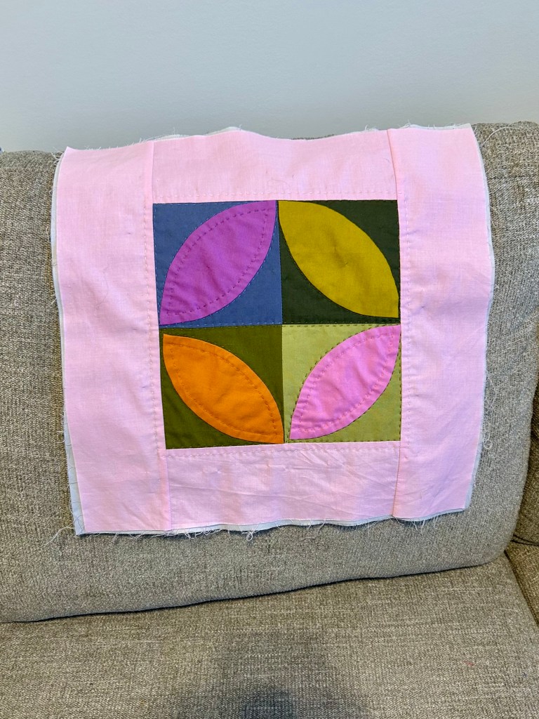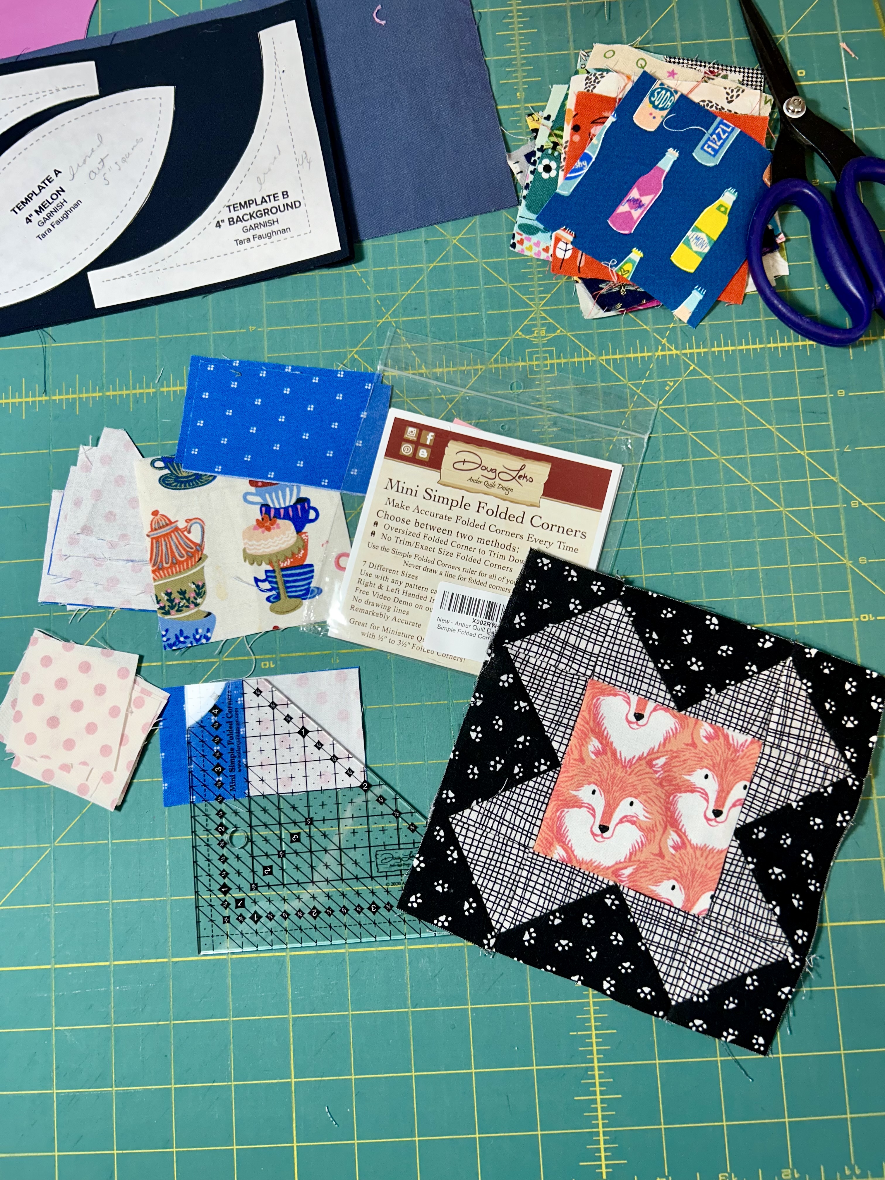 This month’s Tara Faughnan Blocks3 class is “Garnish,” a pickle dish quilt block form. Tara gave us extensive instructions on how to improv cut this block AND many templates of different sizes if we wanted to have a bit more precision.