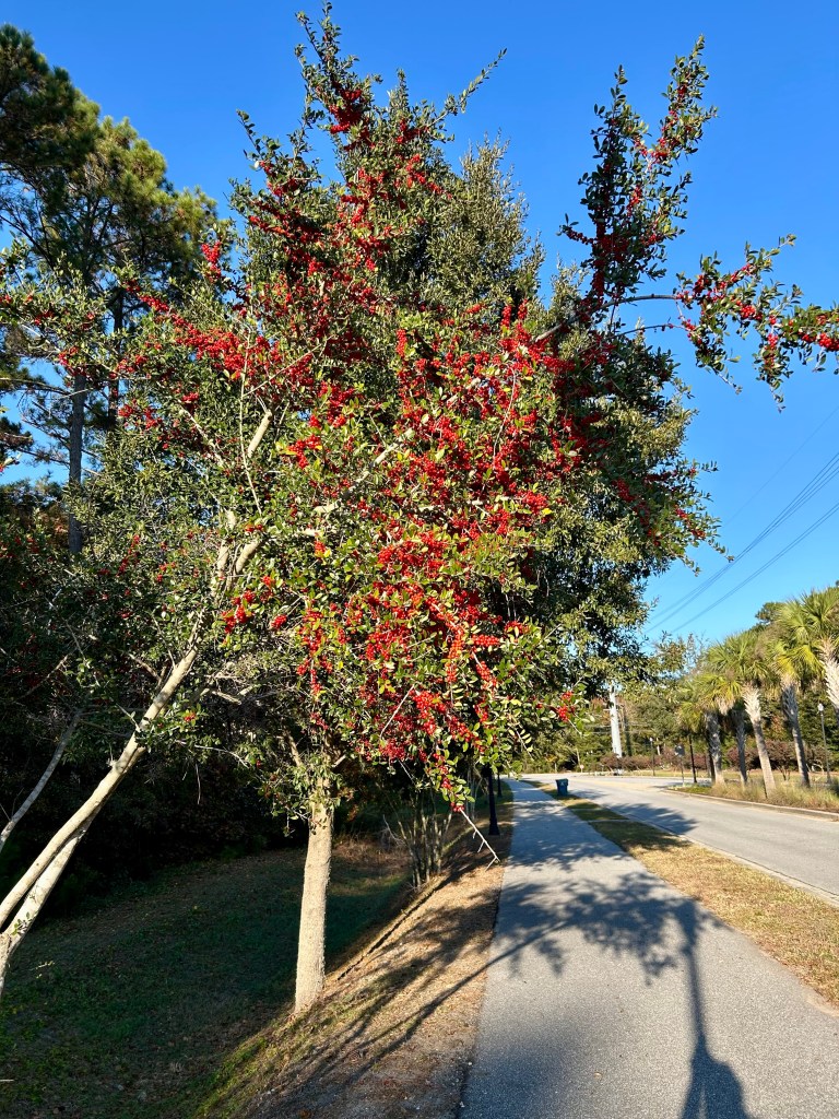 These trimmed back trees along the path I often walk are LOADED with orange berries this year. More than I remember from the past two winters I have been here. They are probably some holly form, and they are all along this path.