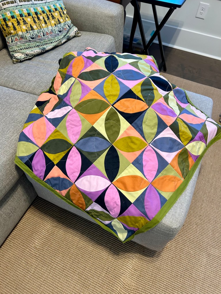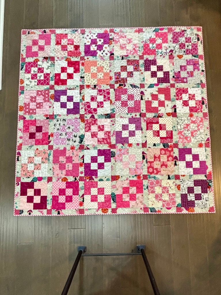 The on-point squares that form caught me by surprise. I didn’t see them coming. But I love how this secondary pattern makes this quilt so much more interesting. I’m still using those 2-inch squares to make four-patch blocks as leader/enders. So there may be another donation quilt from at least the “patches” part of this quilt down the road.