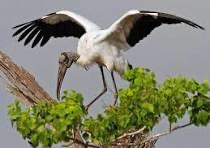 “Large, white Wood Storks wade through southeastern swamps and wetlands. Although this stork doesn’t bring babies, it is a good flier, soaring on thermals with neck and legs outstretched. This bald-headed wading bird stands just over 3 feet tall, towering above almost all other wetland birds. It slowly walks through wetlands with its long, hefty bill down in the water feeling for fish and crustaceans. This ungainly looking stork roosts and nests in colonies in trees above standing water.”