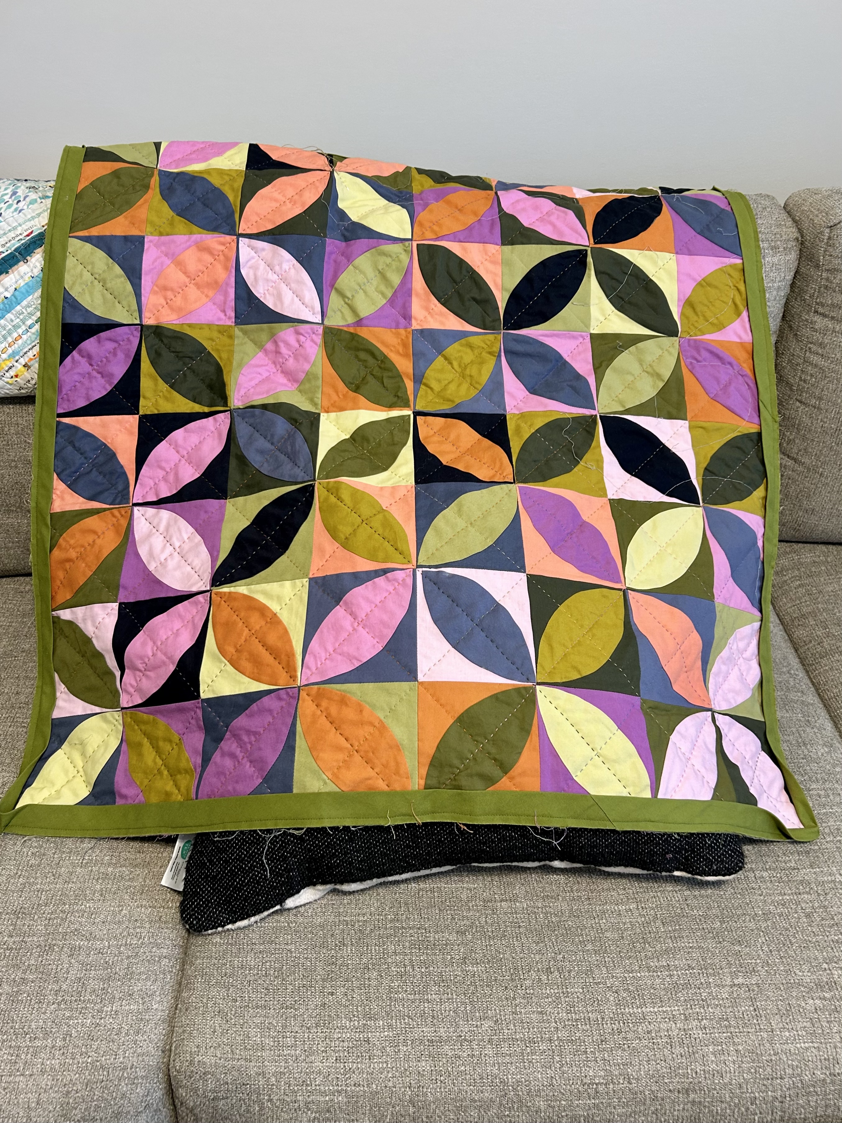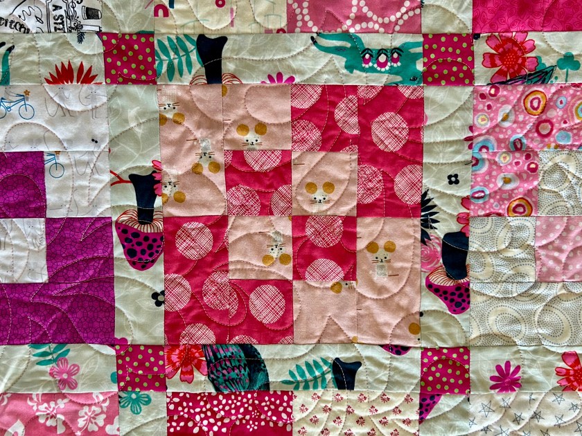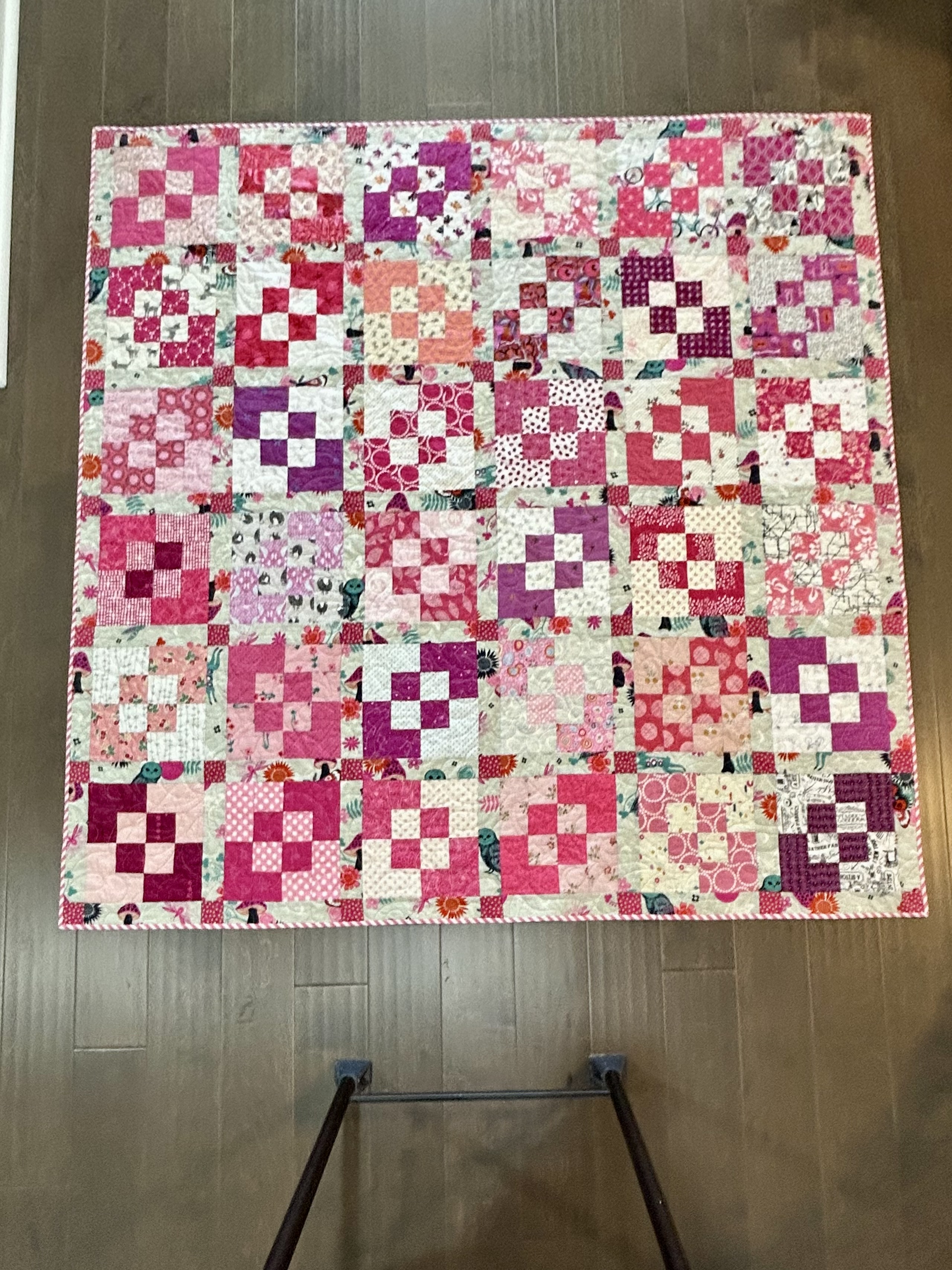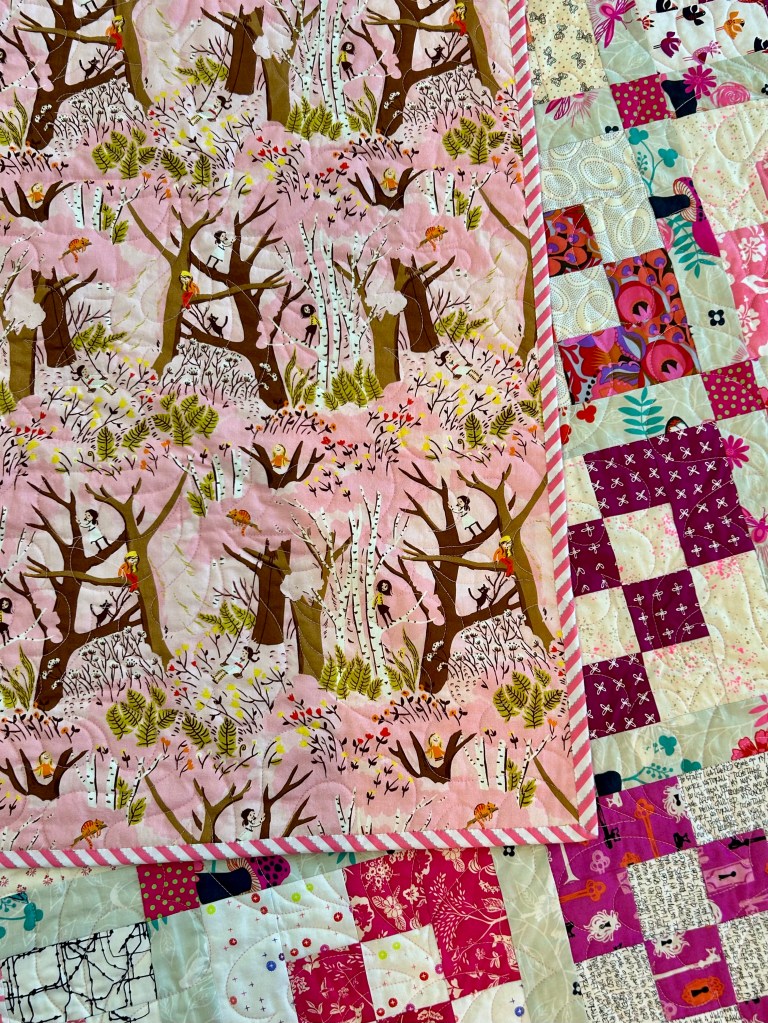 The block is Bonnie Hunter’s “Four Patch Fun,” which is her 2025 leader/ender block. It is free on her blog. I used the pantograph “TwoFold Feathers” by Hermione Agee and the Signature cotton thread “Petal.” The fabrics are all from my stash, and I used the same fabric for the sashing pieces as I had enough of it–and I love the animals it includes, especially the owl. I also like the striped binding cut on the bias.