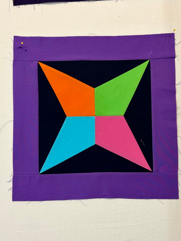The third month in Tara Faughnan’s online Blocks 3 class is “Star Brite.” As usual, Tara gave us many ways to make this 10-inch block. I’ve made diamond stars before now–in an earlier Tara Faughan class with a big Lone Star block. But I’ve never made one of these blocks with an outside trimed edge. I started with this wider edge (the acid green color) form. Now I’ll try the narrower trimmed version she gave us and, maybe even, the “simple” form with no trim. AND, she gave us a scrappy version that I must try as well.