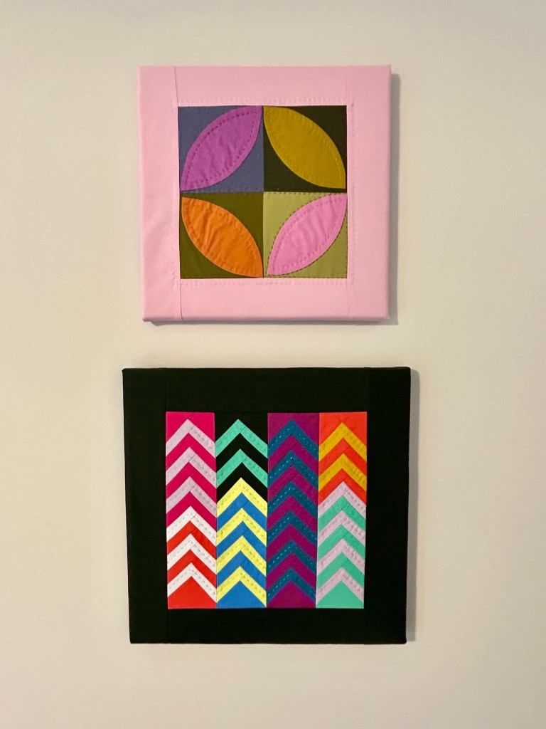The form of this block that drew me strongly was the circle that formed as a secondary pattern. So I went on to make a stretched canvas version, which I hand quilted and hung in my quilt room. (Above a “Crosswalk” block, the first month block in Blocks3.