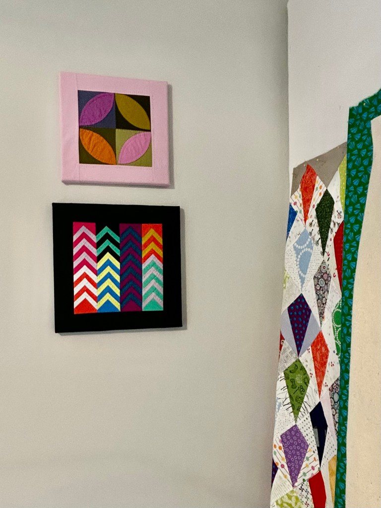 I put the “Garnish” piece I did on stretched canvas and hung it. So here’s “Garnish” and “Crosswalk” now hanging in my quilt room: