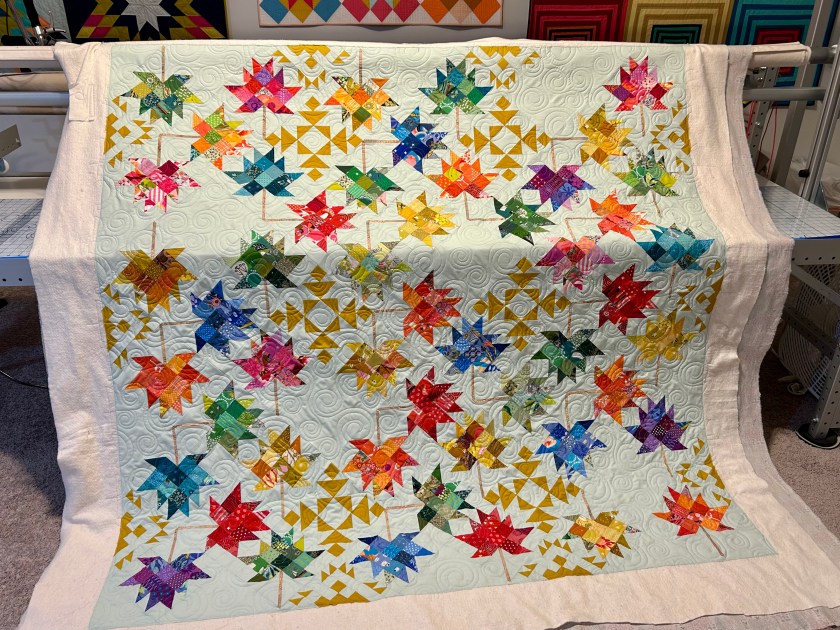 “Under the Maple Tree” is off the longarm, trimmed, and ready for its binding. The texture is awesome for this quilt, with lot of “windy” pantograph swirls.