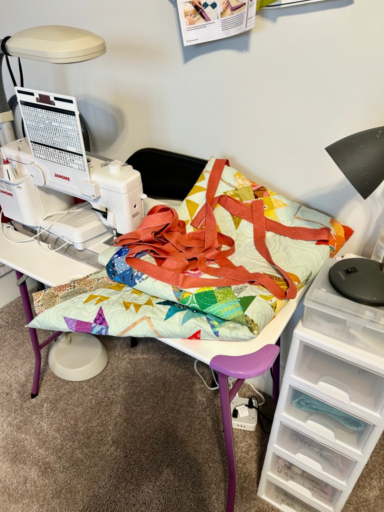 The border triangles were made bigger, so today I’ll trim the sides and sew a “victory lap” seam around all the edges–as that prevents block separation when the quilt goes on the longarm.