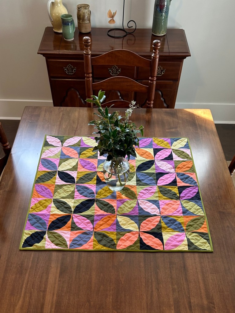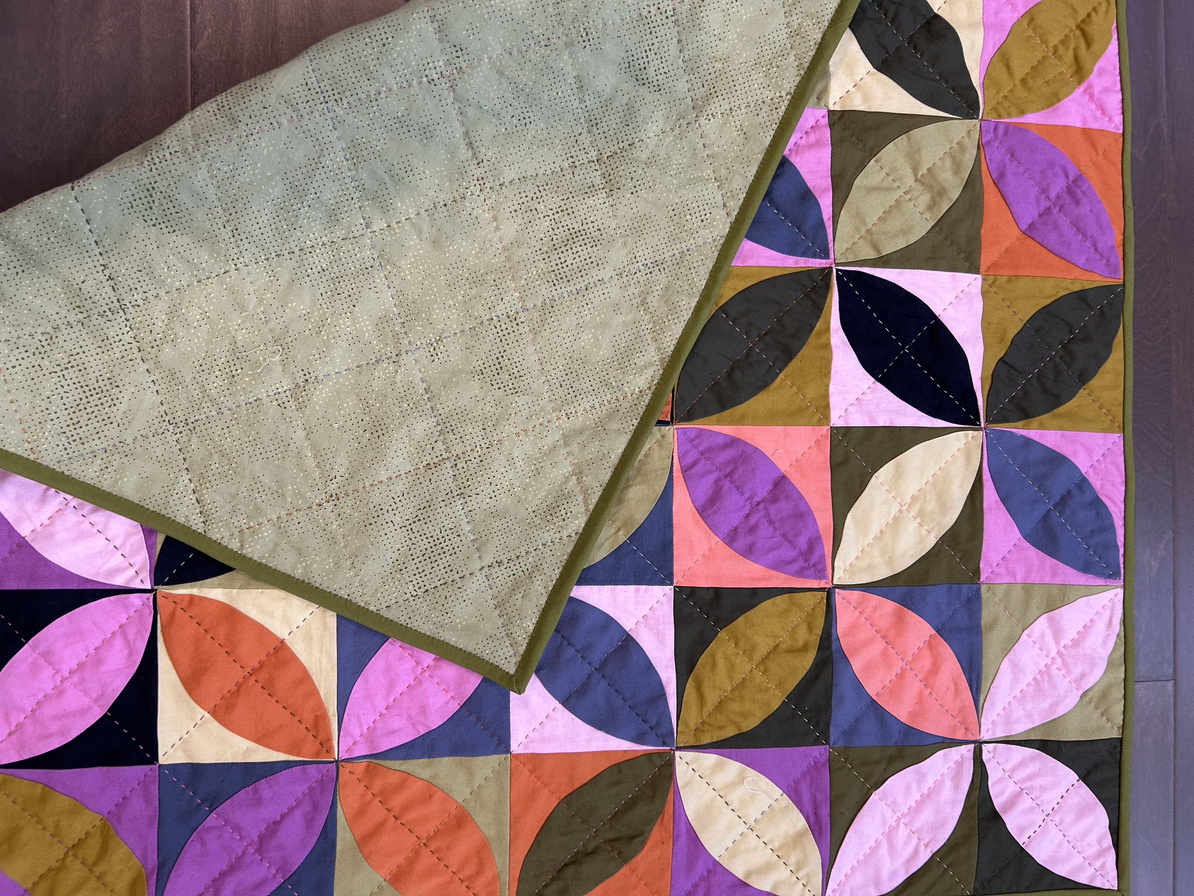 I hand quilted “Garnish” with the collection of 12-weight cotton threads I have amassed over the years of hand quilting. The center join of the “flower” made hand quilting tough in that area, but the rest was a joy.