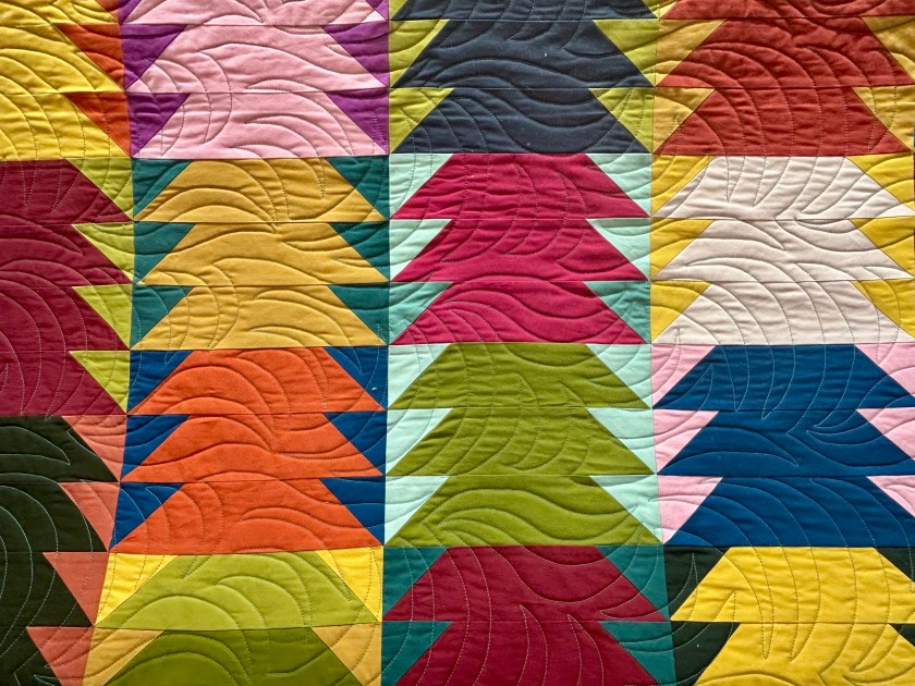“Oh! Wow!”–the 2nd Stacks quilt from a Tara Faughnan pattern in the first season of The Color Collective (2019) is quilted and bound. Pics coming soon. But look at this marvelous texture: