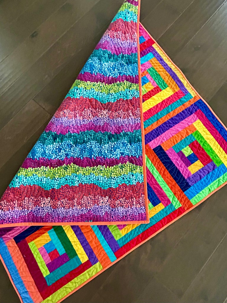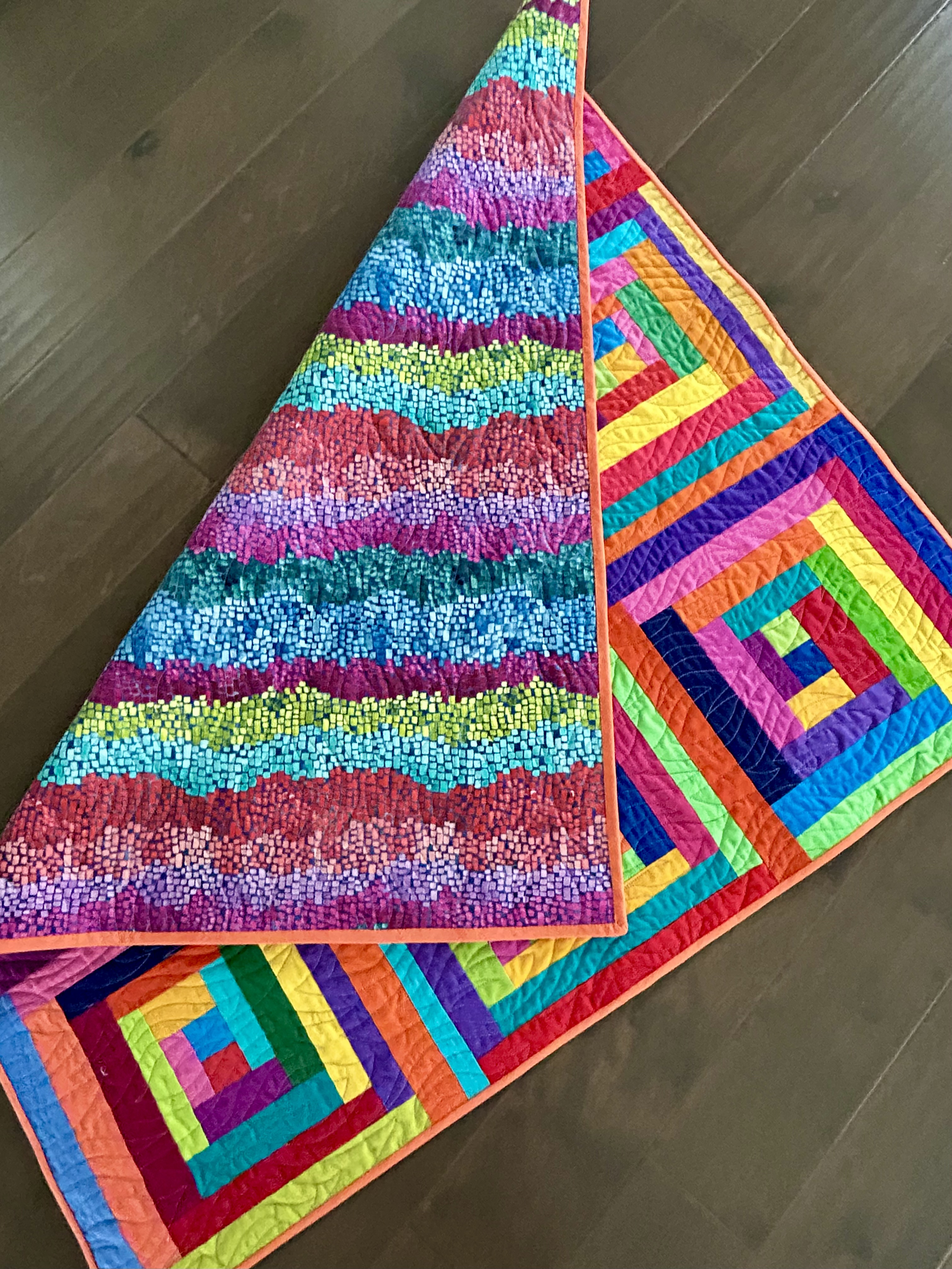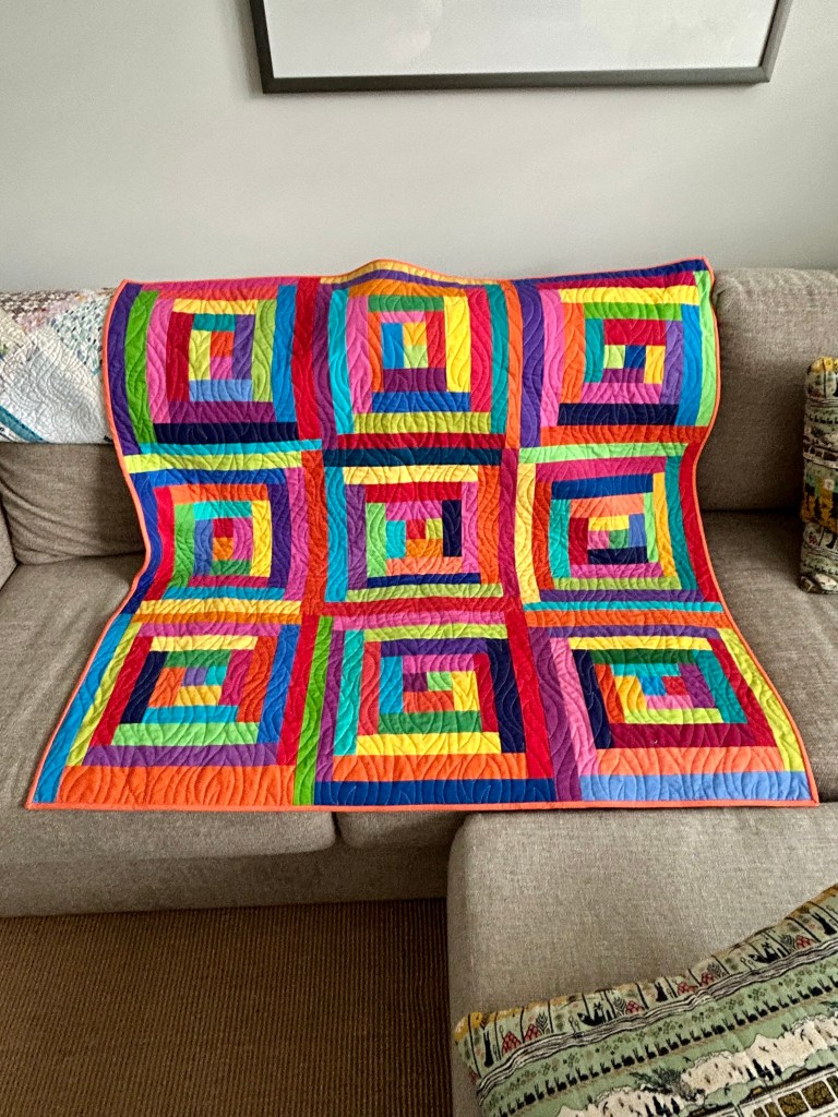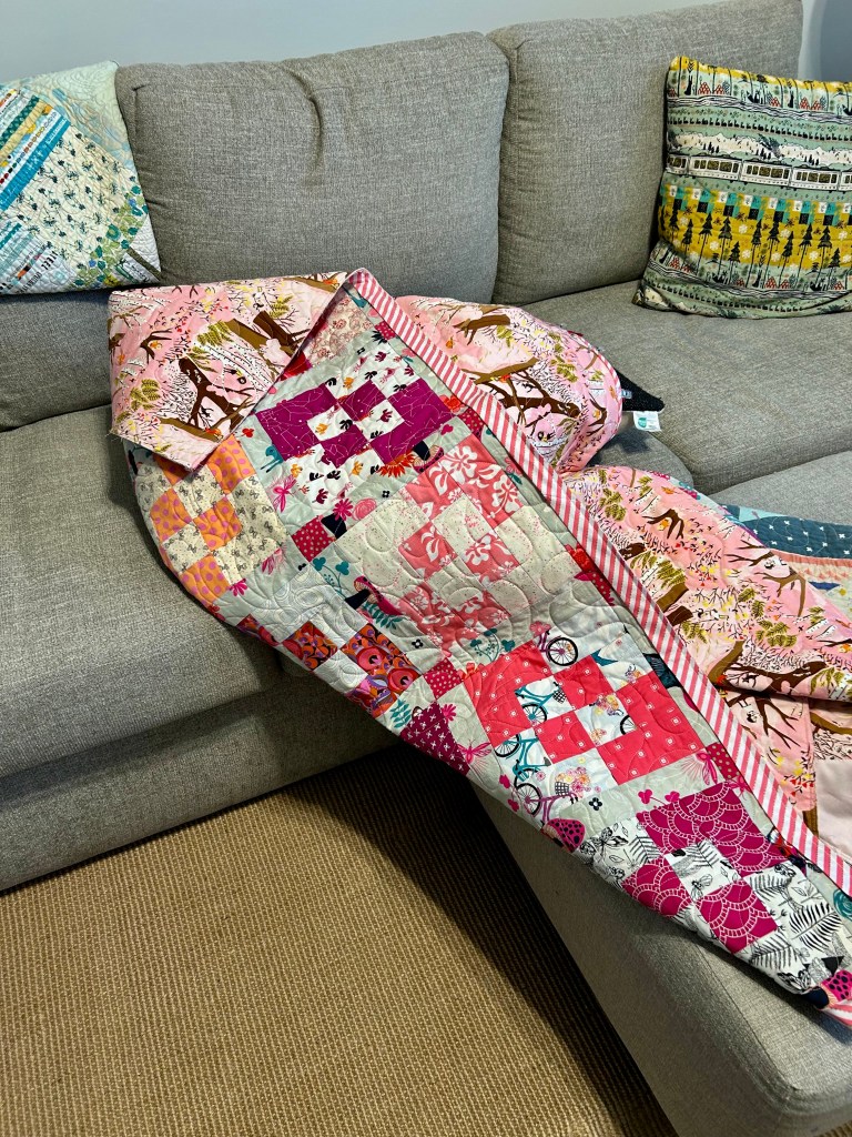 Here’s an idea of the quilt size when seen on a sofa back. It’s a good baby quilt size.