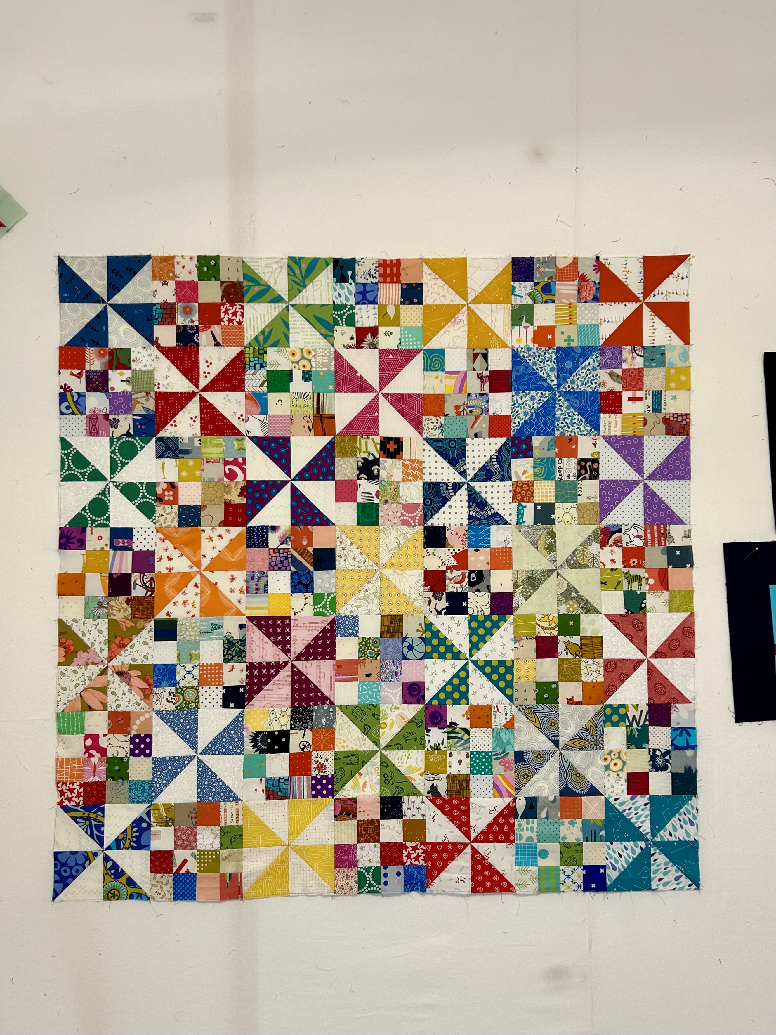 To recall, this is a Tara Faughnan pattern (“Stacks”) from the first The Color Collective in 2019. I made one and gifted it for a wedding present. Then I saved the leftover blocks and fabrics and moved them with me to South Carolina in late 2022. I’ve been trying to catch up with old projects and with using up stash for the past few years, so here’s one result.